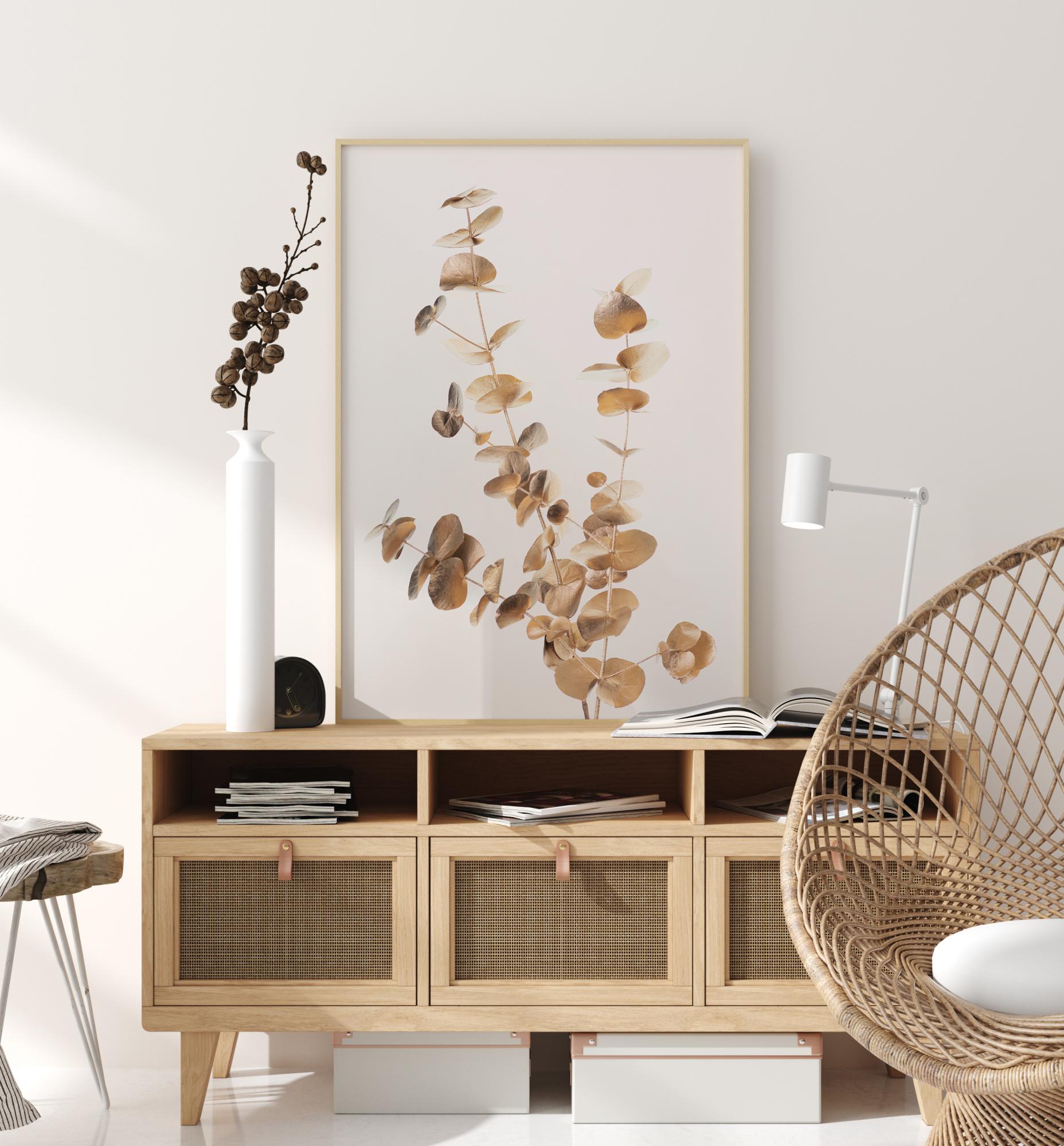 Paprastas plakatas su keliomis auksinėmis eukalipto lapų šakomis. Aukso ir rudos spalvos yra raminančios ir atpalaiduojančios. Šakos yra paprastame baltame fone, todėl ryškus auksas išsiskiria dėl dramatiško, bet elegantiško efekto jūsų namuose.