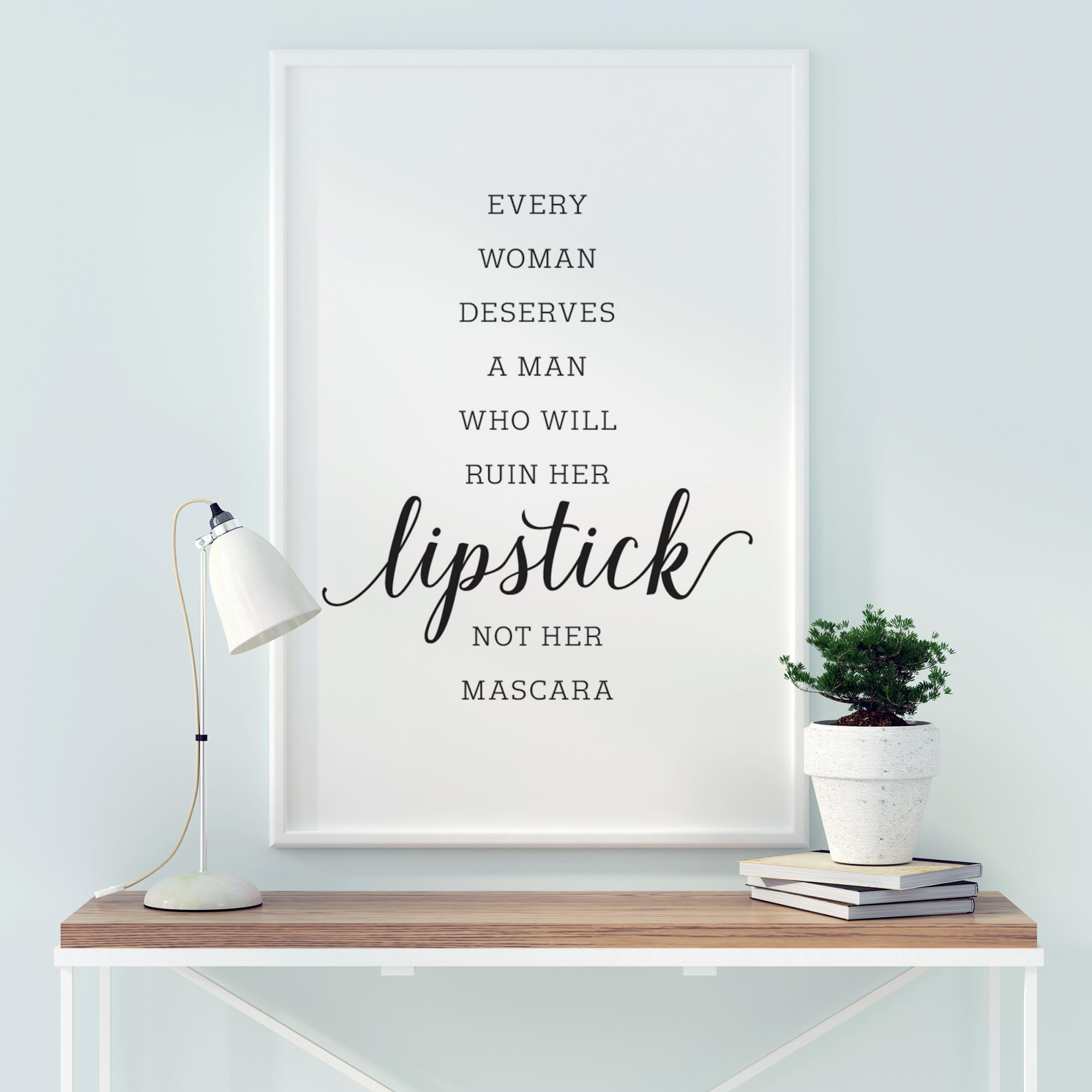 Motyvuojantis plakatas su stipria citata, kuri padės jums pradėti rytą. „Every woman deserves a man who will ruin her lipstick, not her mascara“, kiekviena moteris nusipelno vyro, kuris sugadins jos lūpdažį, o ne jos tušą, yra žodžiai, kuriais verta gyventi. Pradėkite savo dieną teisingai šia paprasta mintimi apie šį mielą kaligrafinį ir įkvepiantį paveikslą.