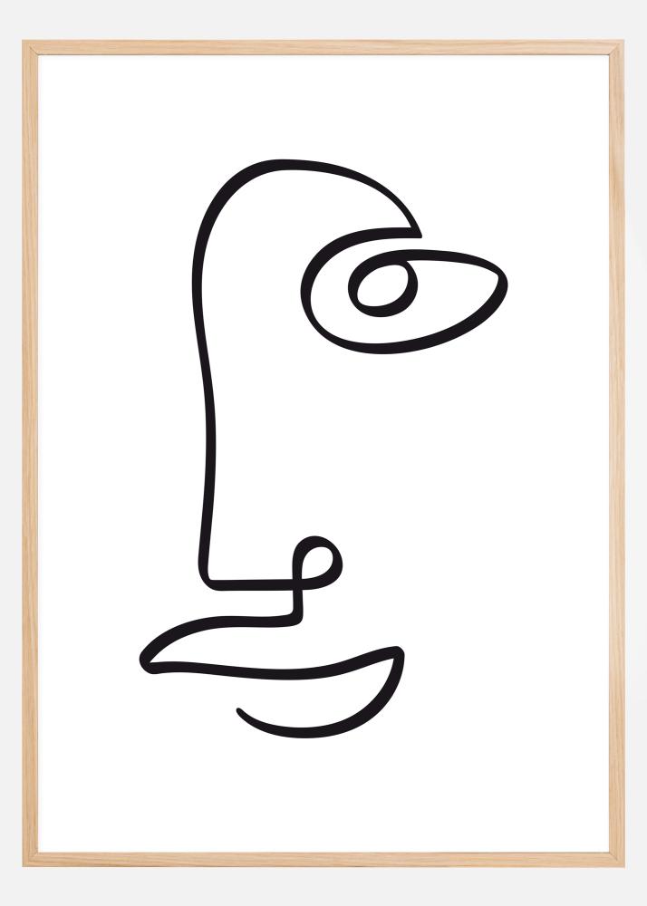 Abstraktus plakatas su veidu, nupieštas juoda linija. Paprasta juoda linija vingiuoja per paveikslą, sukurdama vieną veido pusę, nė karto nepalikdama popieriaus. Apmąstykite šį paprastą vaizdą, kai pakabinsite jį namuose, ir pabandykite pamatyti kitas paslėptas figūras kūrinyje.