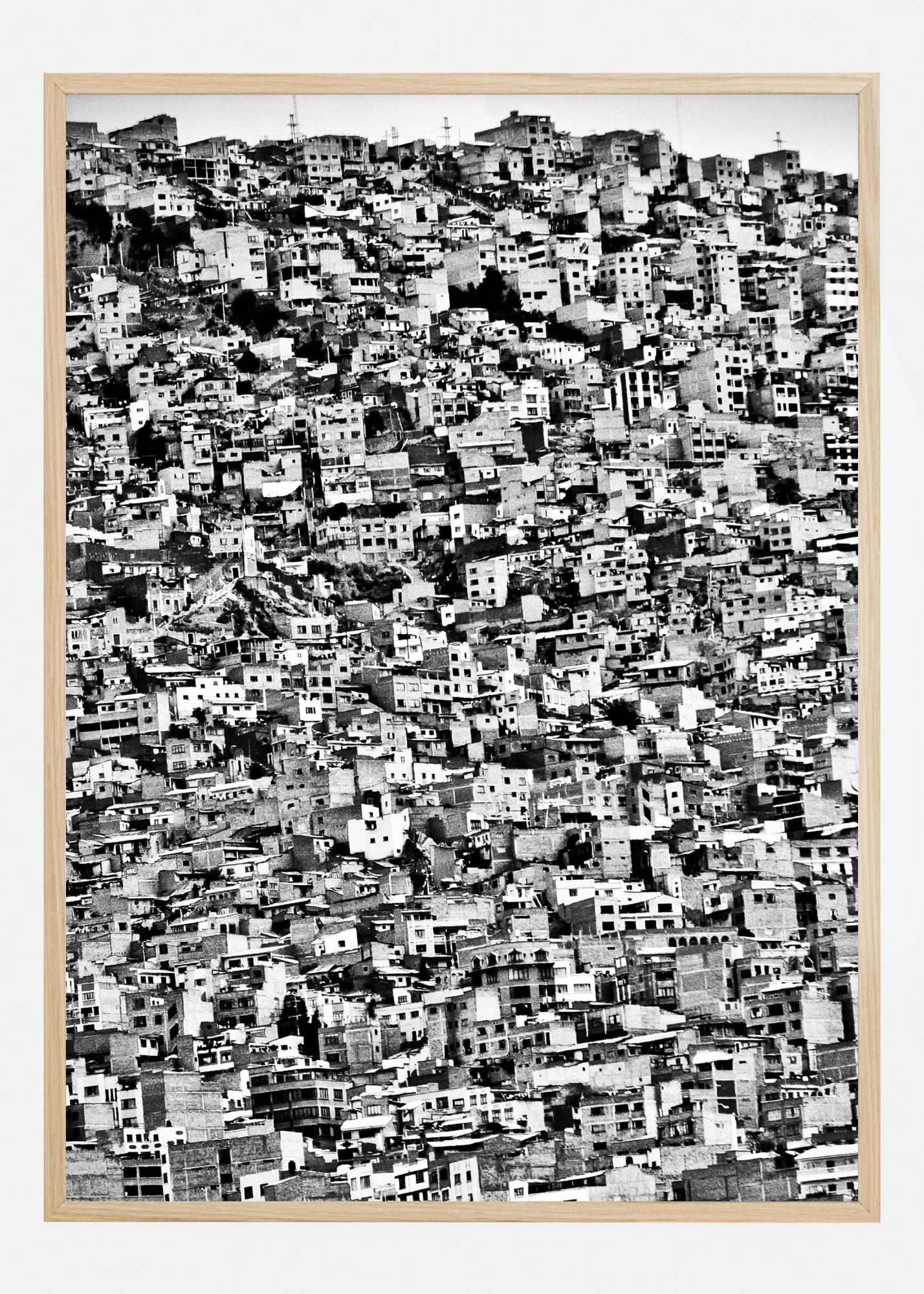 Miestovaizdžio plakatas su šimtais mažų namelių El Alto La Paz Favelos rajone, Bolivijoje. Vaizdas yra pripildytas namų baltų fasadų ir jų atvirų juodų langų, kurie sukuria neramų, bet žavų vaizdą. Pasiklyskite namų labirinte kabančiame jūsų namuose.