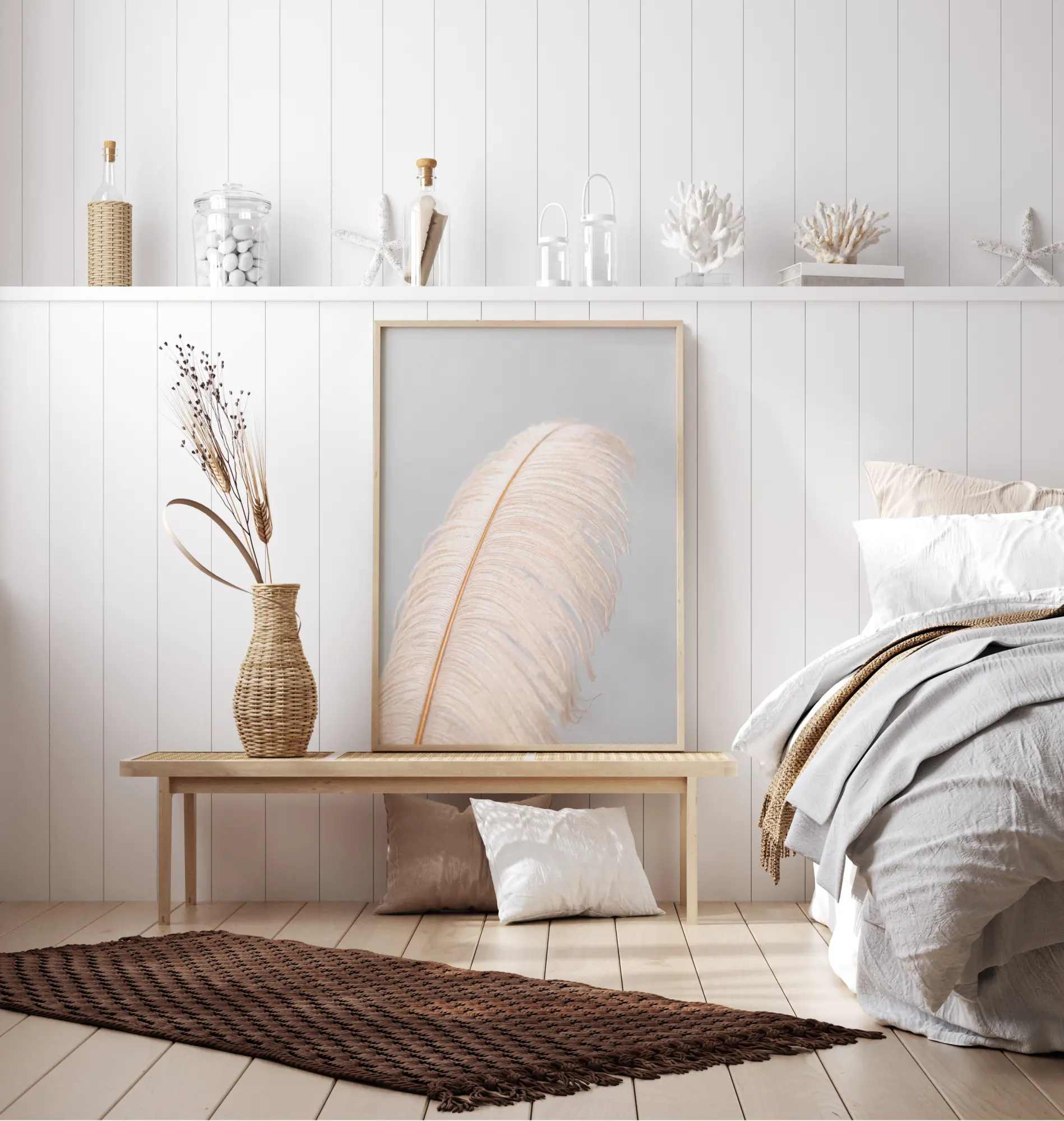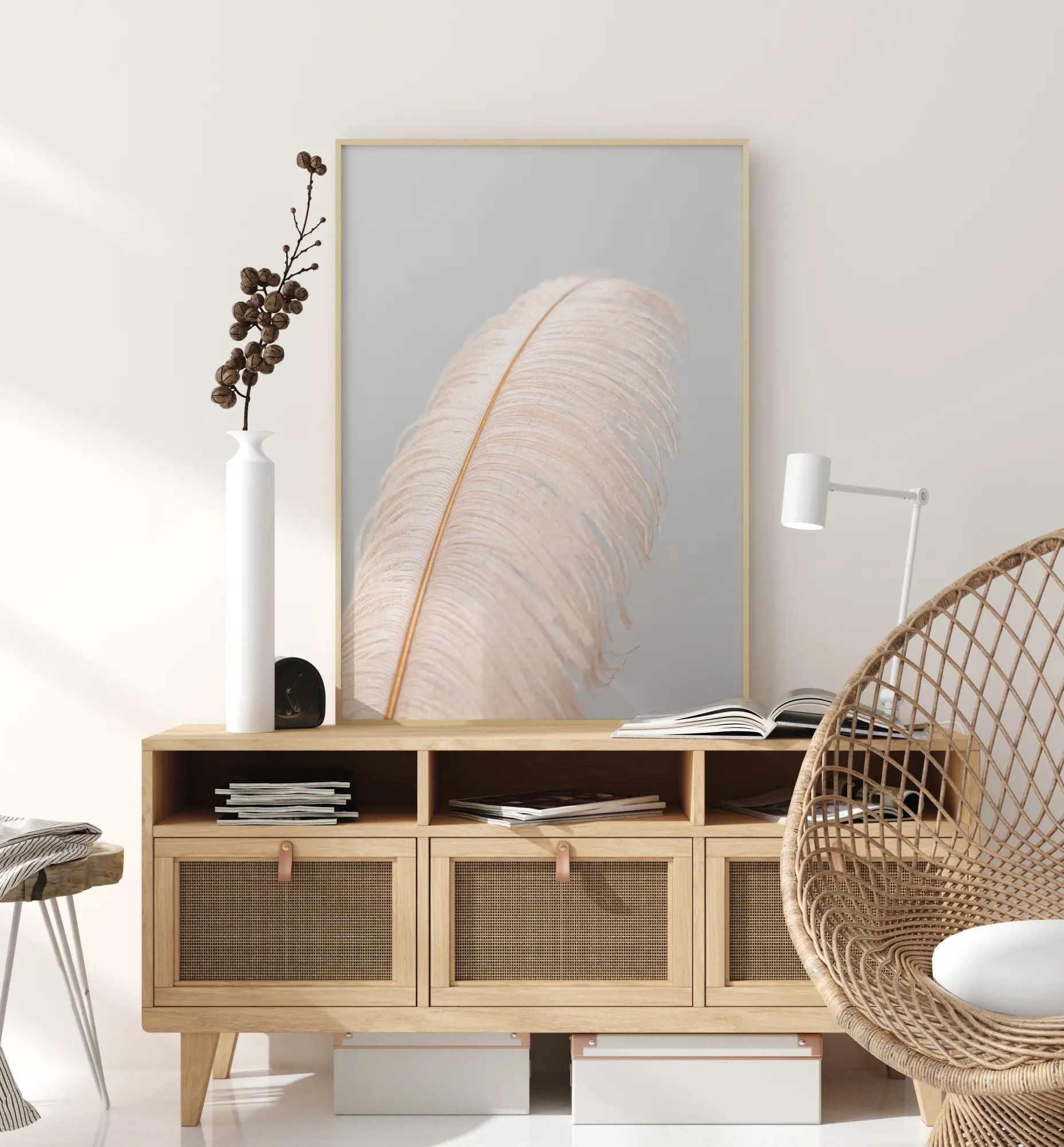 Stambaus plakatas su dideliu stručio plunksnu. Minkštos baltos vėduoklinės sruogos plaukia abiejose rožinio centrinio kotelio pusėse. Plunksna yra priešais dangiškai mėlyną foną, kad suteiktų šiam vaizdui šiek tiek pasakiškumo jausmą. Tai yra puikus priedas vaiko kambariui.