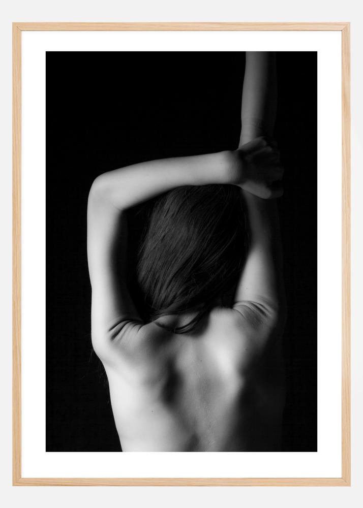 Portretinis plakatas su moters nugara. Ši nespalvota nuotrauka išryškina tolygus nugaros raumenis, kai ji pakelia vieną ranką aukštyn ir lenkia kitą ranką per galvą. Dalys jos yra panirusios šešėlyje. Pakabinkite šį kūrinį namuose, kad suteiktumėte šiek tiek meninį įspūdį.