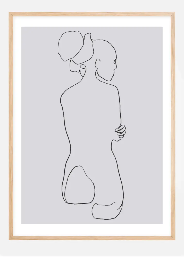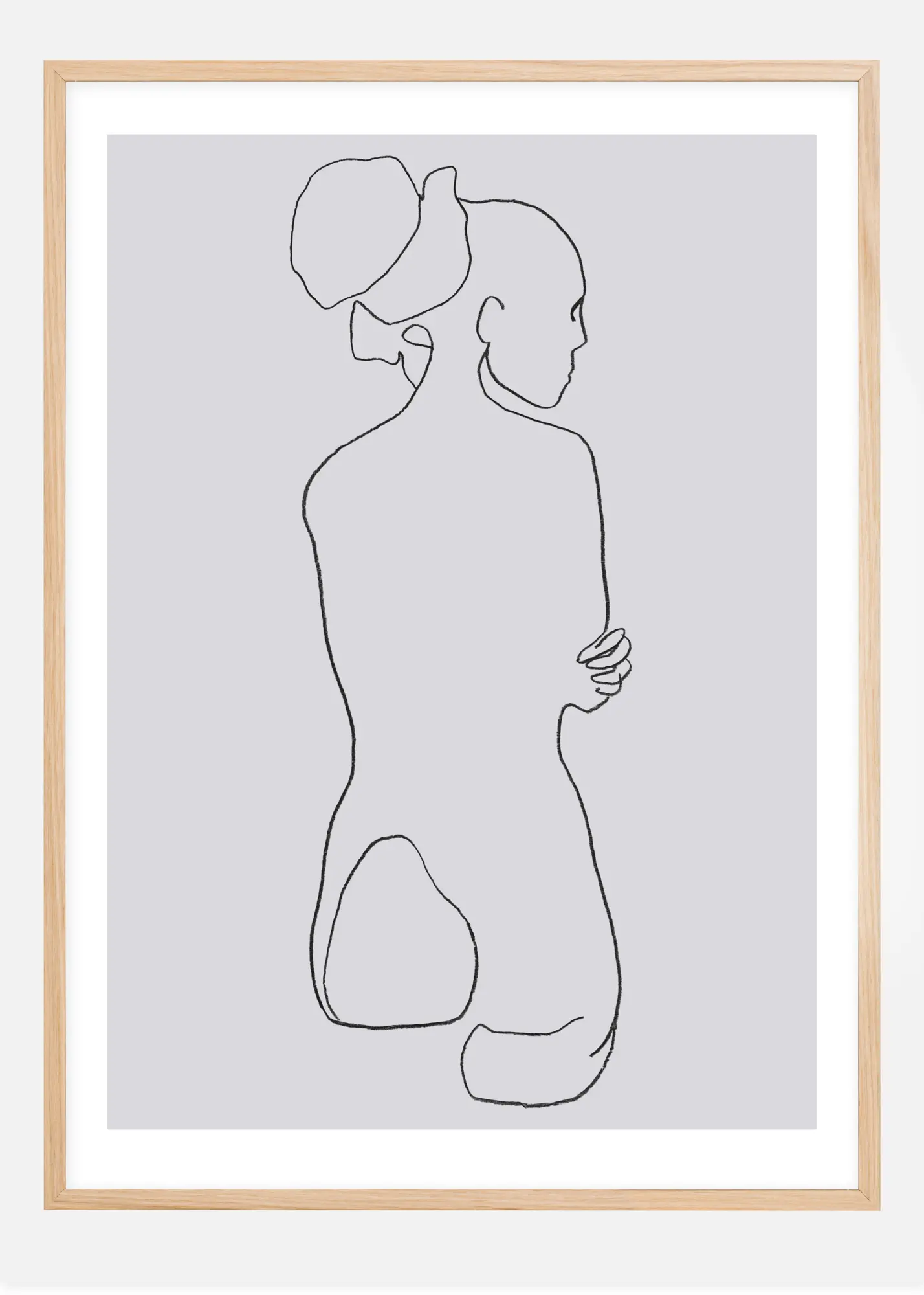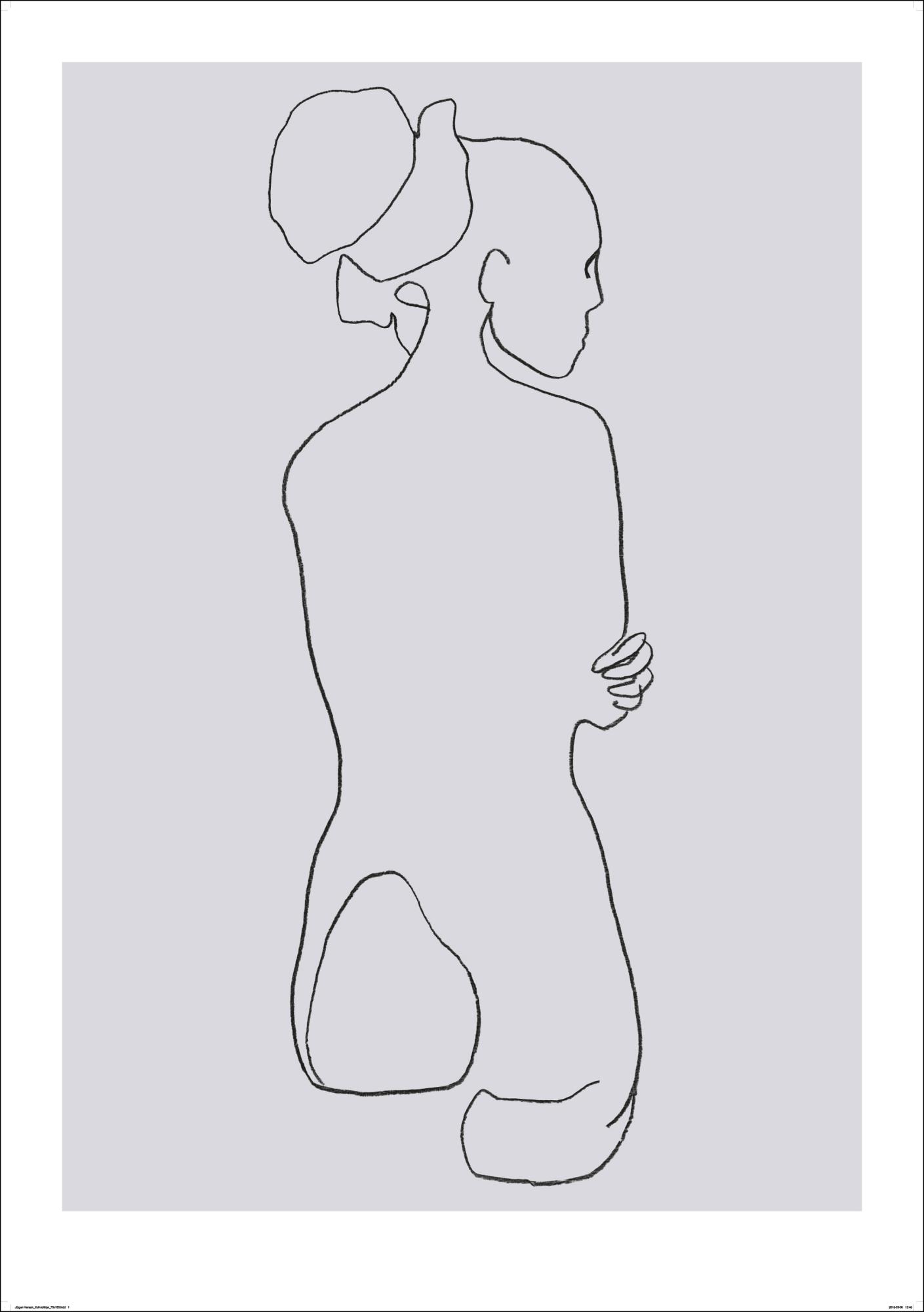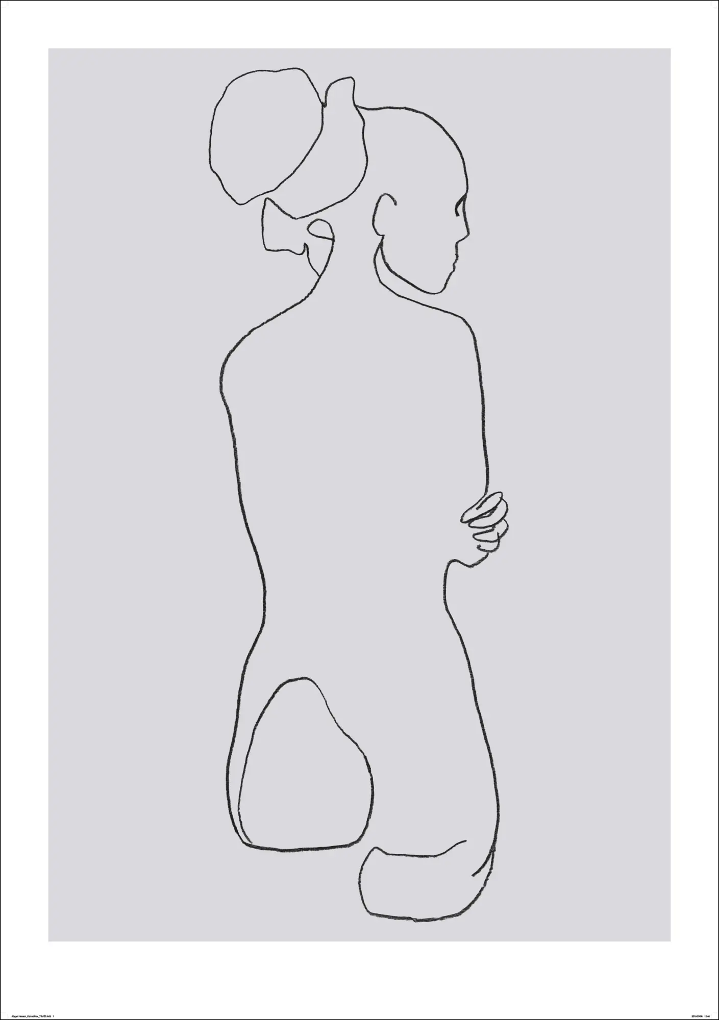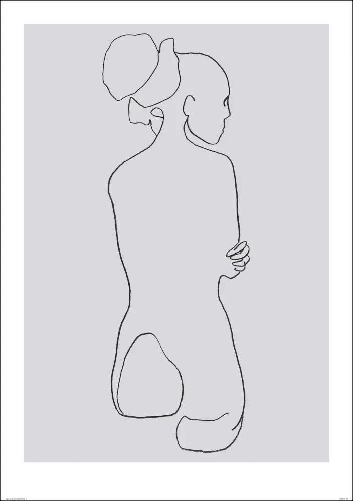 Grakšti linijų meninė kūrinių, vaizduojančių moters nuogą nugarą ir surištus plaukus, sukurta menininko Jörgen Hansson iš Jörgen Hansson Art. Stilingas plakatas, kurį galima derinti su Jörgen Hansson kūriniais Female Lines II ir Female Lines III.