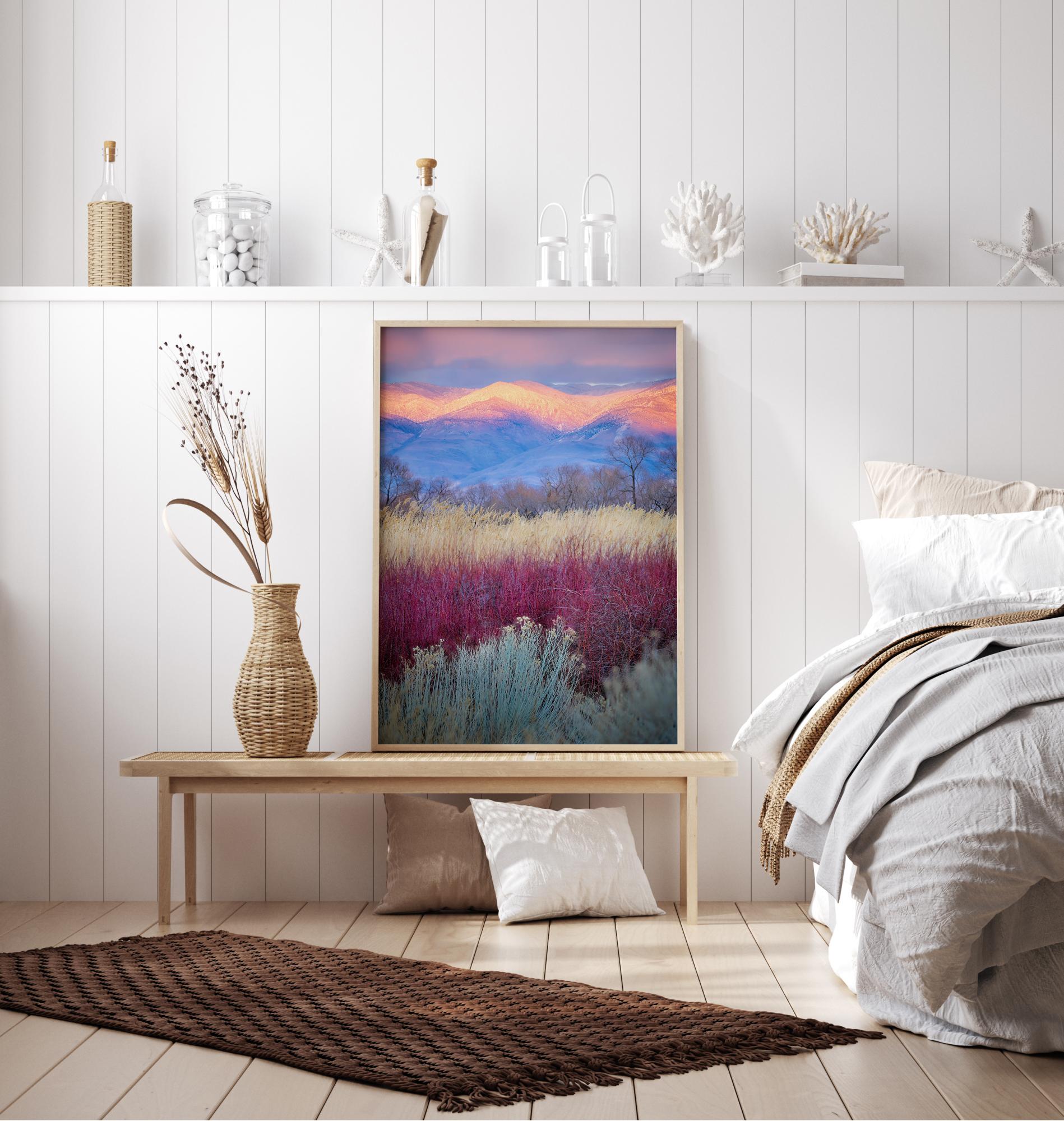 Spalvingas plakatas su laukais, besitęsiančiais link tolimų kalnų. Ryškios spalvos veda žvilgsnį nuo žalios, rožinės, geltonos, mėlynos iki oranžinės. Saulė tik šmėkščioja virš kalnų tolumoje. Pajuskite ankstyvo ryto šviesą ir naują dieną šiame kūrinyje.