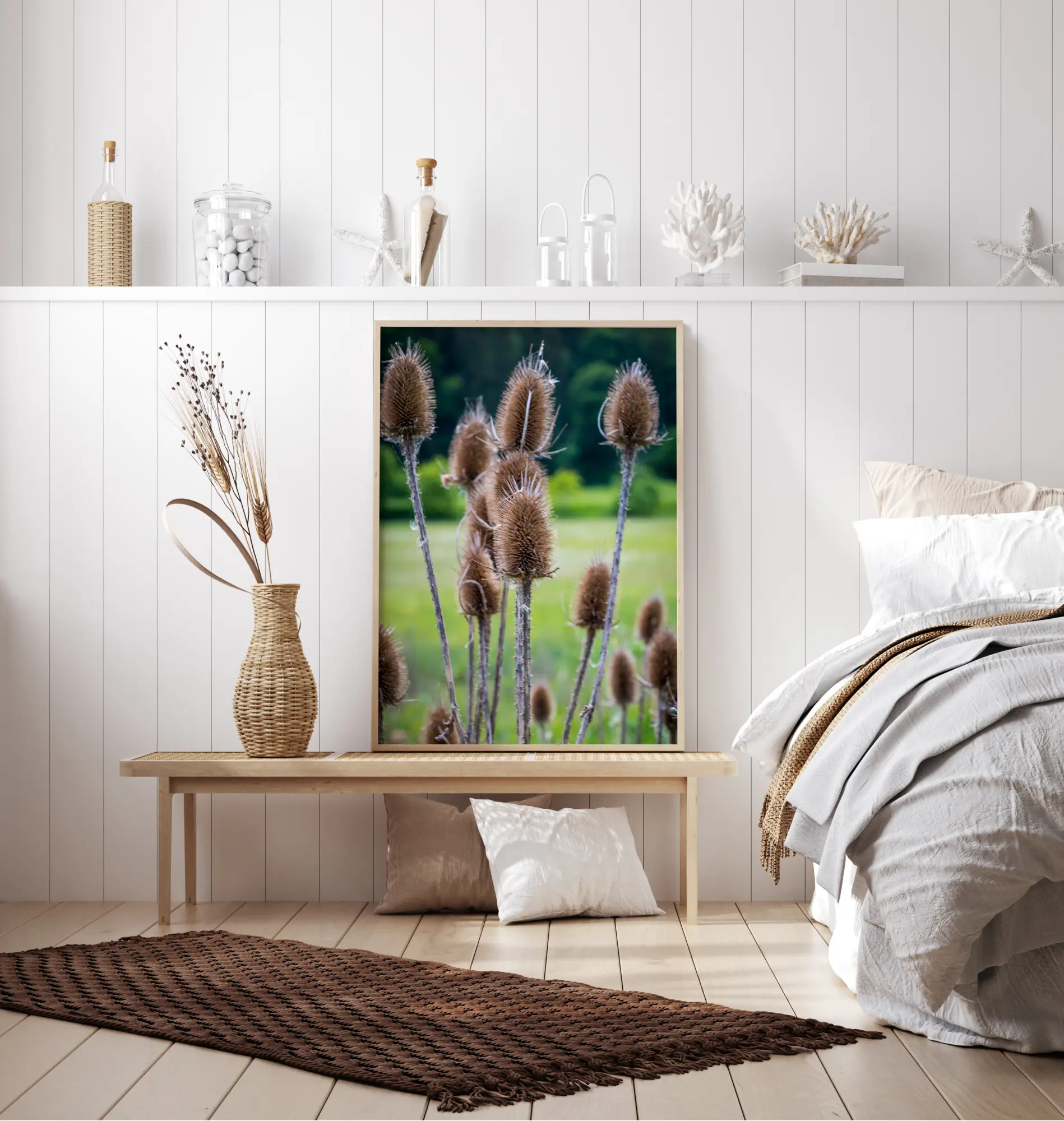Stiprus plakatas su keliais sėklų kapsulėmis lauke. Sausos rudos kapsulės siekia dangų. Šviesiai žalias laukas už jų sukuria kontrastą, kuris pritraukia dėmesį į aštrius spyglius. Atsineškite gamtą į namus pasitelkdami šį vaizdą.