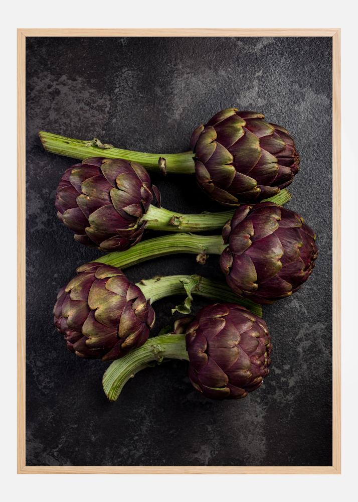 Šis kaimiškas ir gamtos įkvėptas plakatas vaizduoja penkias atspalviais turtingas artišokų galvas prieš tamsų, tekstūruotą foną. Artima nuotrauka išryškina žaliai gilios ir purpurinės spalvos artišokų lapų atspalvius, o gamtos motyvas puikiai tiktų virtuvėje ar valgomajame, kur jis galėtų įkvėpti kulinarinėms kelionėms. Šis spausdinimas yra ne tik duoklė gamtos grožiui, bet taip pat priminimas apie šviežio maisto gebėjimą sujungti žmones.