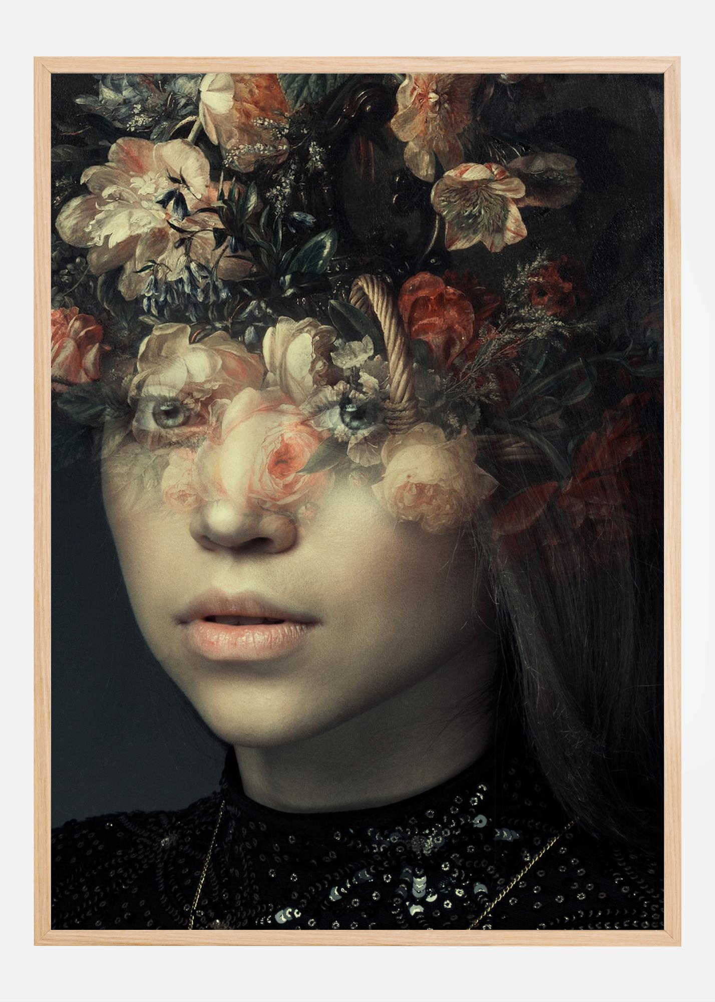 Šis kerintis plakatas sujungia žmogaus portreto grožį su nepaliesta gamtos estetika. Kūrinys vaizduoja moterį, kurios veidą iš dalies dengia sodri gėlių kompozicija, suteikianti mistišką ir beveik svajingą efektą. Šis meno kūrinys su žydinčia vainikėliu ir švelnia, natūralistine spalvų palete spinduliuoja nesenstančią eleganciją ir meninį rafinuotumą.
