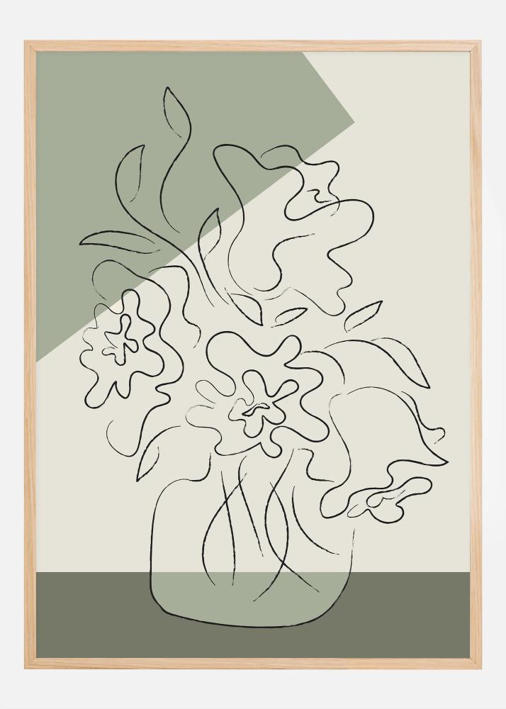 Šis meniškai abstraktus plakatas vaizduoja stilizuotus žiedlapius ir lapiją elegantišku, plaukiojančiu linijiniu piešiniu, kuris sklandžiai susilieja su dvigubos spalvos fonu švelniuose žaliuose ir neutraliuose tonuose. Dizaino paprastasis grožis, sustiprintas švelnia tekstūra, suteikiančia organiškumo jausmą, sukuria atsipalaidavusią ir ramią atmosferą. Šis modernus ir stilingas atspaudas puikiai derėtų minimalistiniame arba skandinaviško įkvėpimo namuose, suteikiant natūralių ramybės pojūtį, neužgožiant patalpos per daug spalvų ar sudėtingumo.
