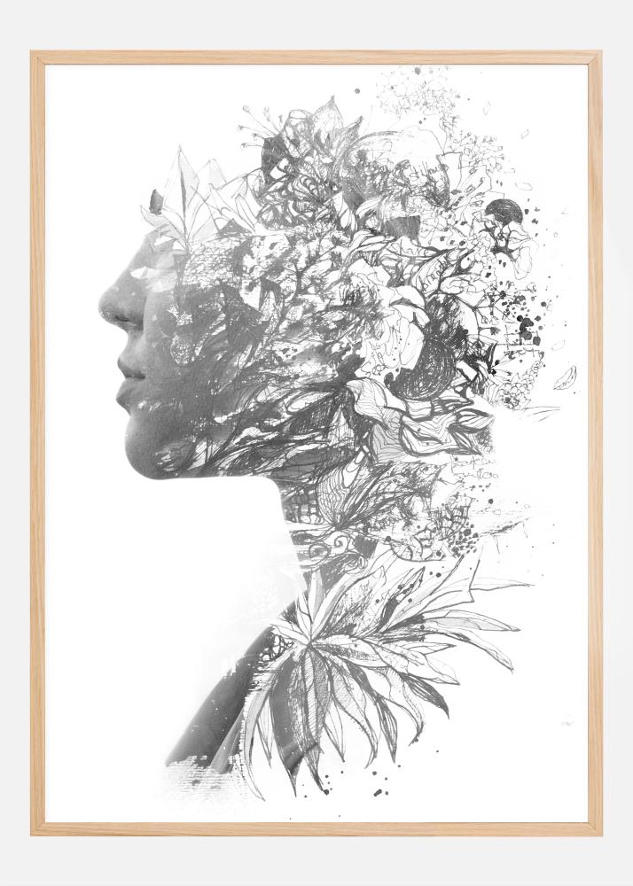 Šis meninis plakatas sujungia moters profilį su detaliu ir sudėtingu gėlių bei augalų piešiniu, sukuriant įdomų žmogaus figūros ir gamtos subtilių detalių derinį. Juodai baltas spalvų schemos suteikia amžinumo pojūtį ir pabrėžia subtilią tekstūrą bei sudėtingumą tiek žmogaus figūroje, tiek gėlių motyvuose.