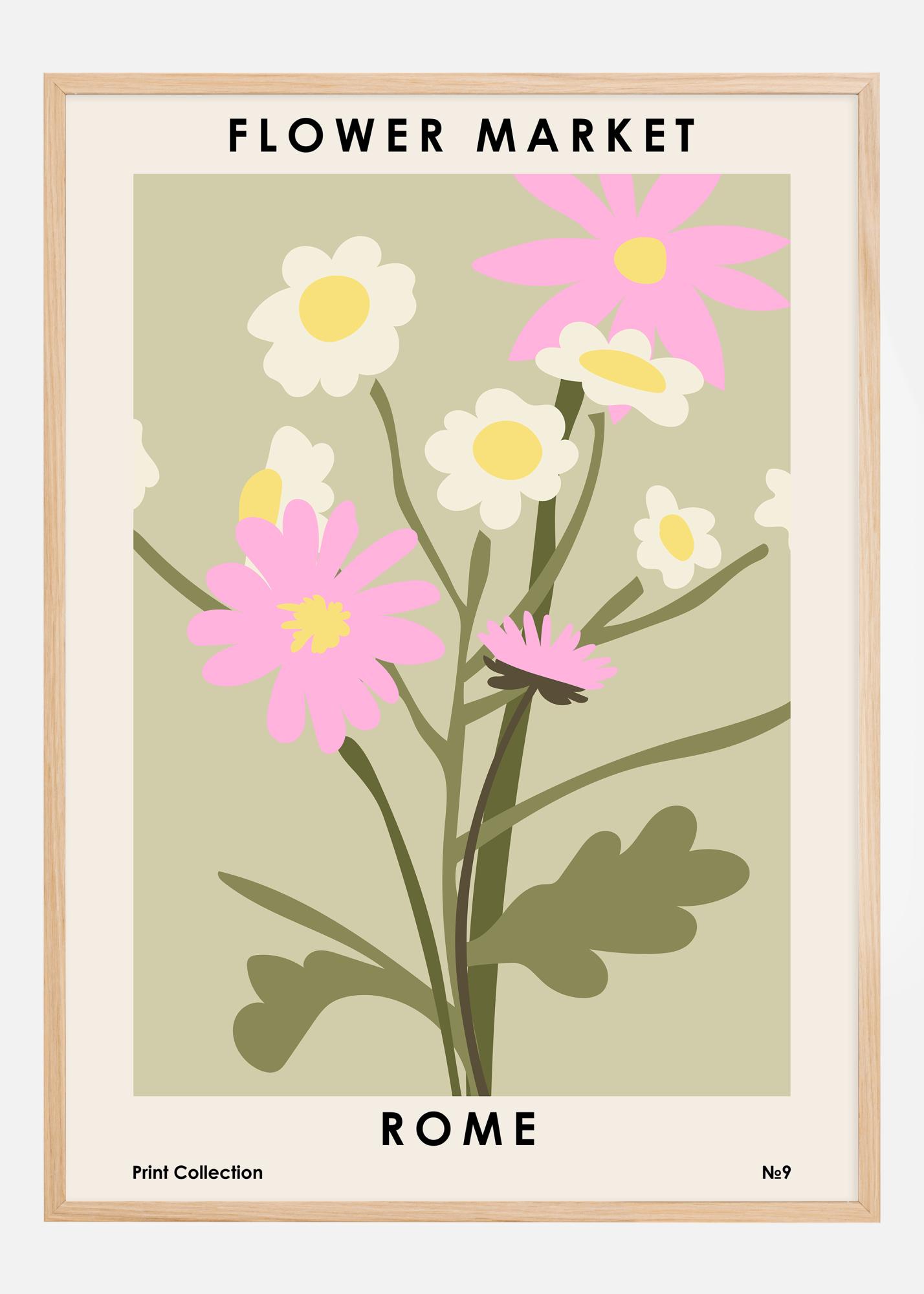 Su šviesiu ir kviečiančiu dizainu šis plakatas vaizduoja šiltą ir gyvybingą gėlių turgaus Romoje atmosferą. Dėmesys sutelktas į detalių gausą ir žaismingą spalvų naudojimą, su didelėmis rožinėmis gėlėmis, papildytomis subtiliomis baltomis gėlėmis, visos ant raminančio alyvuogių žalios spalvos fono. Šis paveikslas puikiai tinka įvesti Romos amžinojo miesto jausmą ir jos meilę grožiui ir gamtai į jūsų erdvę.