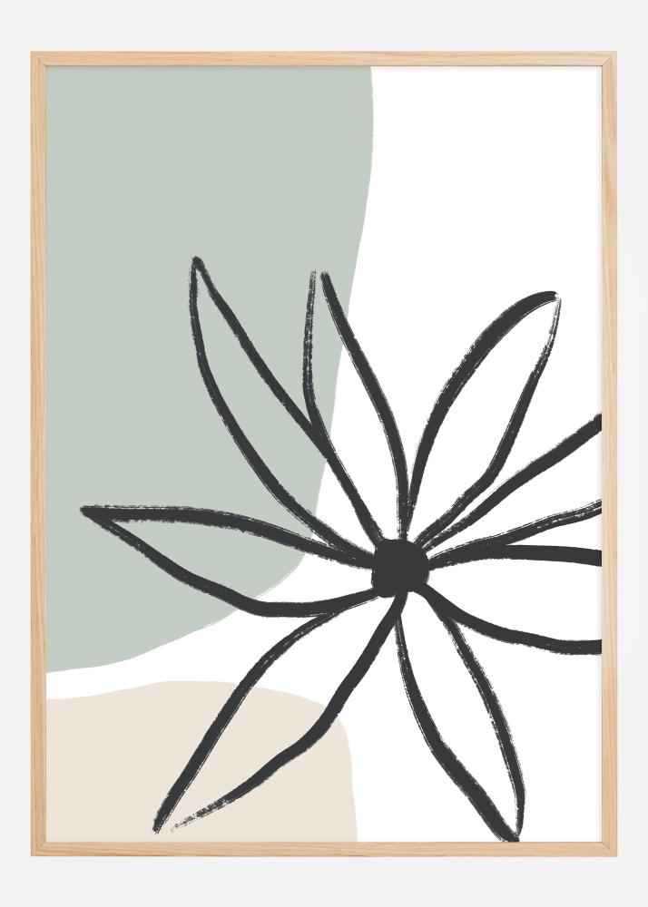 Šis plakatas „Gėlė – mėtų ir grietinėlės“ spinduliuoja paprastumu, kuris yra tiek šiuolaikiškas, tiek amžinai elegantiškas. Jo motyvas vaizduoja stilizuotą gėlę, pavaizduotą galingais juodais teptuko potėpiais raminančiame mėtų spalvos fone, sukuriantį kontrastą, kuris yra tiek drąsus, tiek subalansuotas. Kreminė, neutrali spalva, užpildanti apatinę nuotraukos pusę, suteikia švelnų kontrastą, papildantį minimalistinį dizainą.