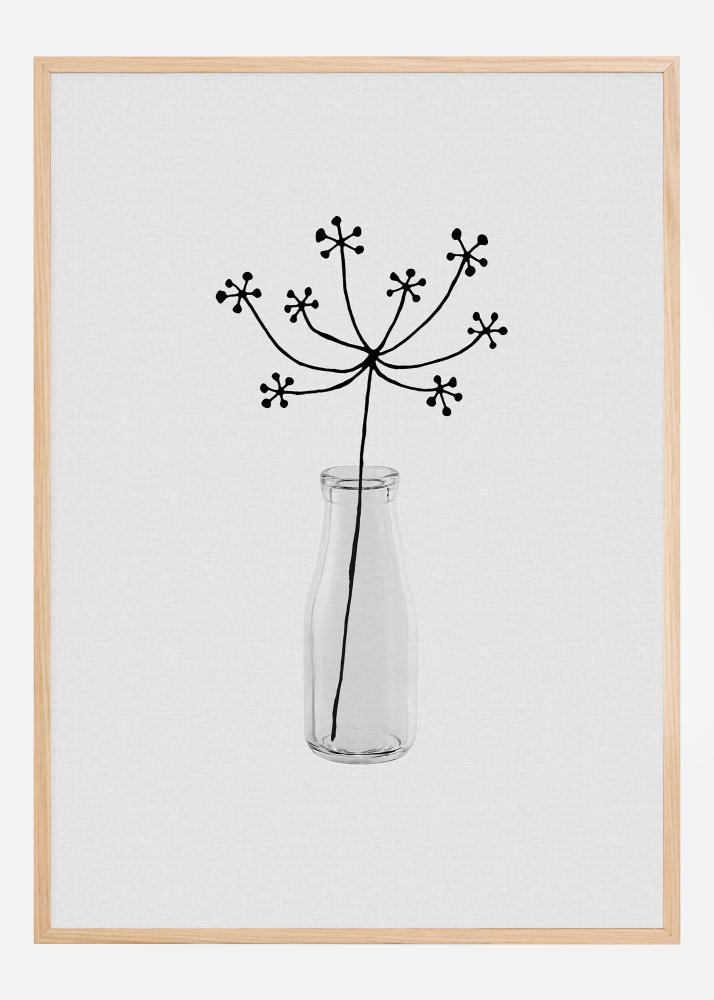 Šis žavus ir meninis plakatas vaizduoja gėlės silueto paprastumą ir grožį. Minimalistinis stilius perteikia žydinčio augalo esmę su ryškiais juodais kontūrais, kurie ilsisi permatomame vazone, taip sukuriant stilingą ir raminantį atvaizdą. Šis meno kūrinys puikiai tinka suteikti gamtos įkvėptą estetiką moderniam interjerui.