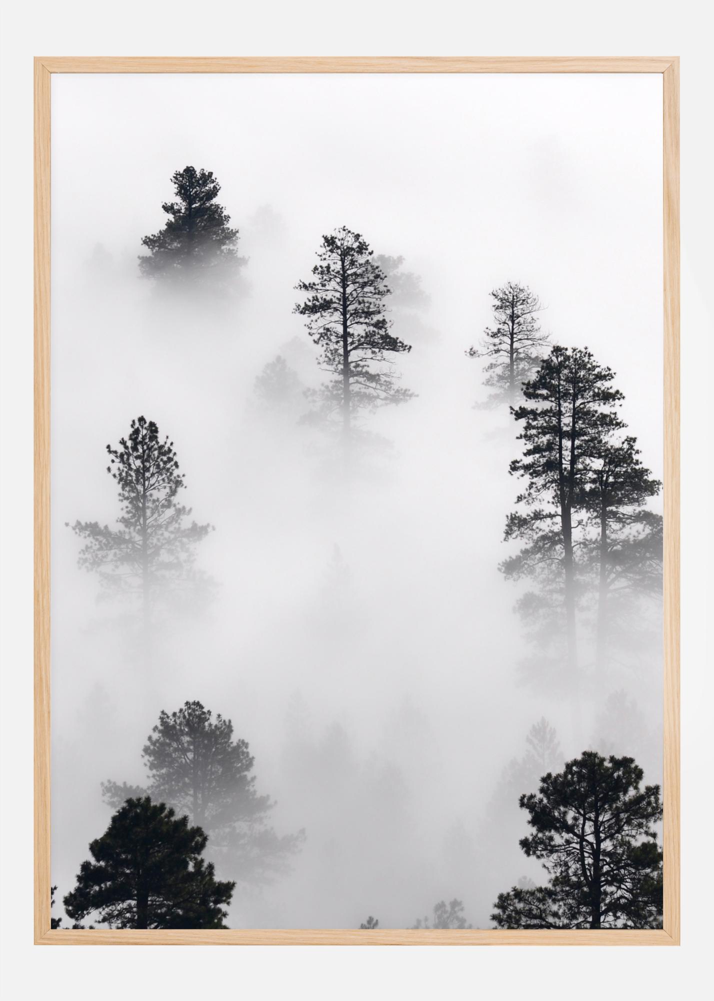 Fantastiškas kraštovaizdžio plakatas su mišku rūke. Aukštos tamsios medžių viršūnės išnyra iš blyškios baltos rūko, sukurdamos stiprų kontrastą tarp rūko ir medžių. Atsineškite vėsų žiemos pojūtį į savo namus, pakabindami jį ant neutralios sienos.