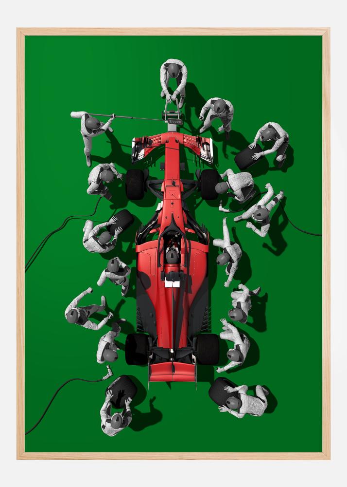 Su sprogstančiomis spalvomis ir veiksmais ši įtraukianti afiša suteikia žvilgsnį į adrenalino kupiną „Formulės 1“ pasaulį. Prie drąsiai žalio fono vaizduojama ikoniška pitstopo scena, kurioje sidabriniais ir baltais kombinezonais vilkintys mechanikai puikiai sinchronizuotai dirba aplink ryškiai raudoną lenktyninį automobilį. Ši kontrastinga kompozicija yra greičio meno ir automobilių sporto precizijos pagarbos ženklas.