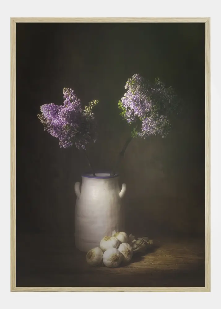 Natiurmortas plakatas su ąsotėliu su violetinėmis alyvų gėlėmis ir česnako skiltelėmis. Rustiškas vaizdas, kuriame baltieji česnakai yra susiraizgę prie balto ąsotėlio pagrindo. Dvi alyvų šakos kyla aukštyn ir yra įrėmintos tamsios sienos fono. Pakabinkite šį subtilų plakatą, kad sušvelnintumėte kietą sieną.