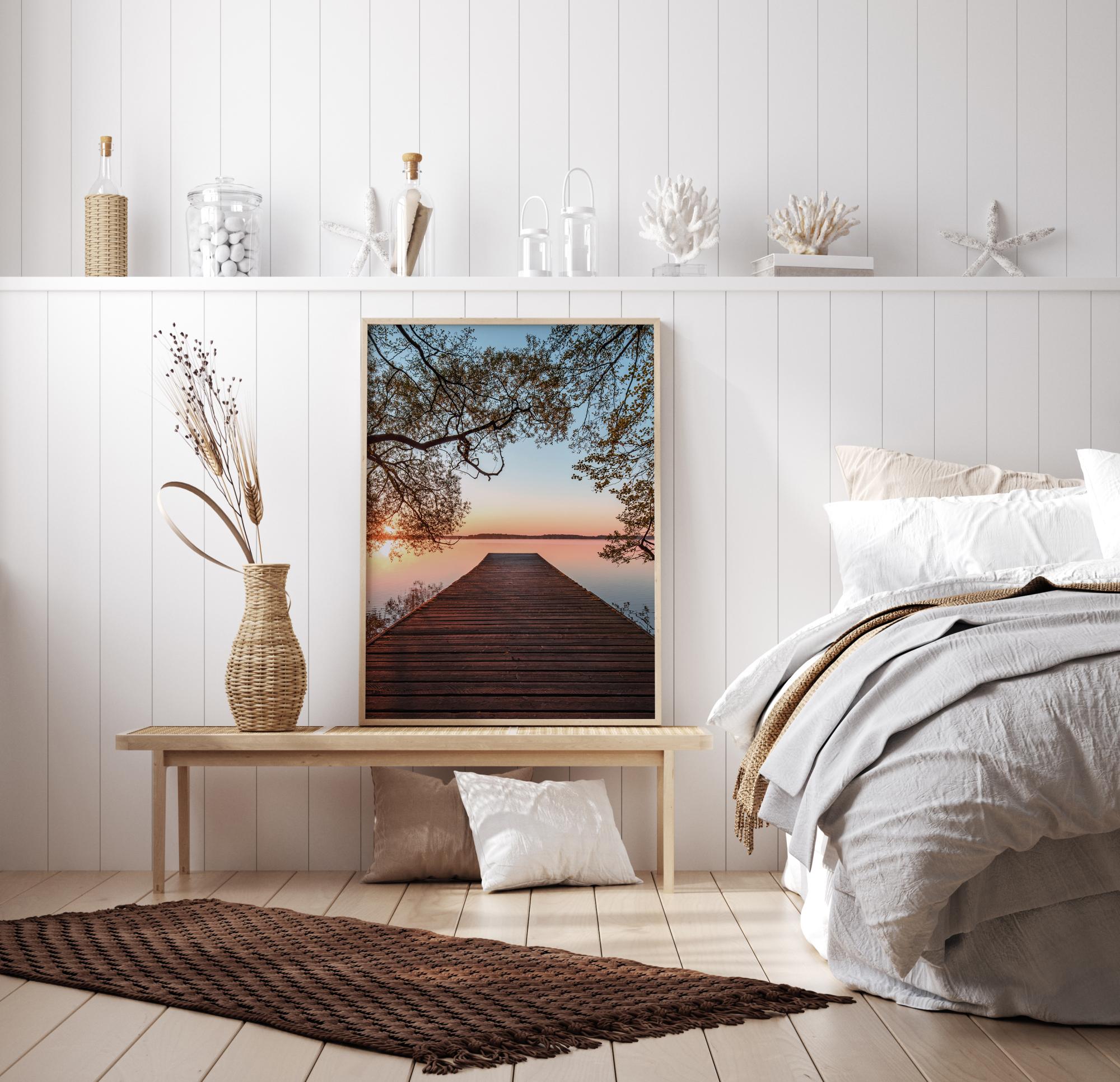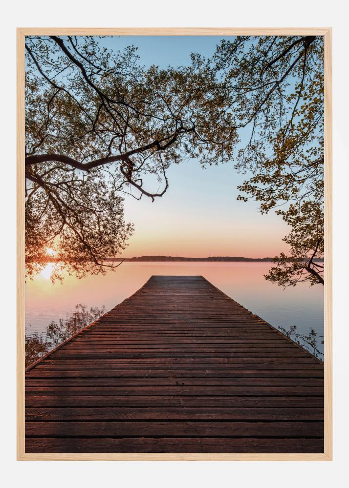 Nuotaikingas plakatas su lieptu, nusidriekusiu per ežerą šviesią dieną. Medžių šakos įrėmina lieptą, vedantį link lengvai mėlyno ir persiko spalvų ežero bei dangaus. Pajuskite laisvės jausmą, atsinešdami tai namo.