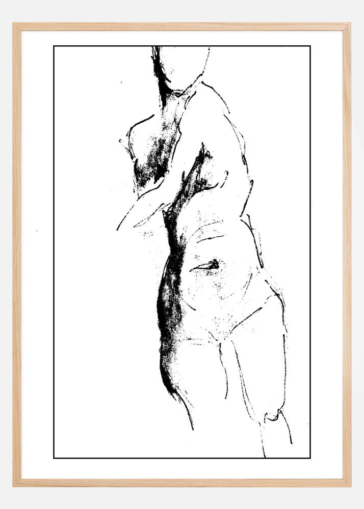 Figūrinis plakatas, kuriame nuoga moteris atsisuka. Šios nuotraukos piešimo stilius padeda sukurti judesio pojūtį, kai modelis atsisuka ir sukioja rankas per krūtinę. Ši juodai balta spauda puikiai atrodys ant spalvingos sienos.