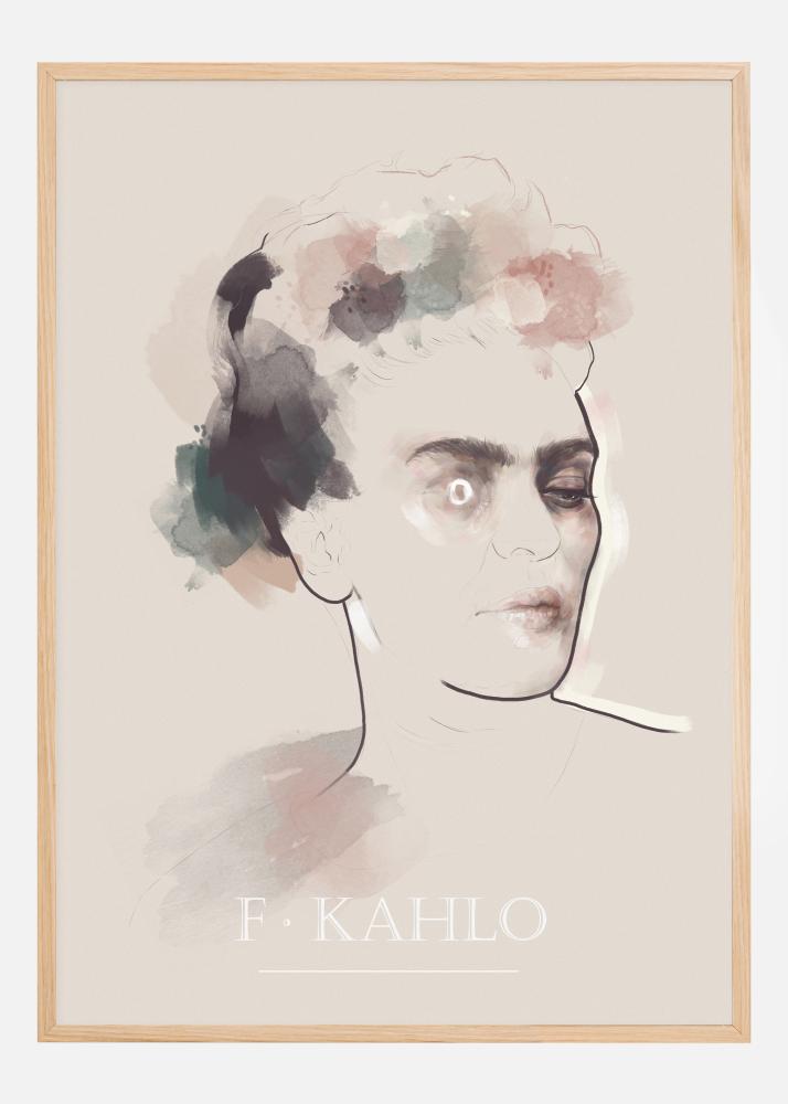 Abstraktus portretas-plakatas su Frida Kahlo su gėlėmis plaukuose. Paprastas Fridos piešinys iš karto užfiksuoja jos esmę, nes ji drąsiai žvelgia iš paveikslo. Vienintelės spalvos dėmės yra jos lūpos ir galvos apdangalas iš gėlių jos plaukuose. Derinkite šias spalvas ant sienos, kur ją pakabinate.