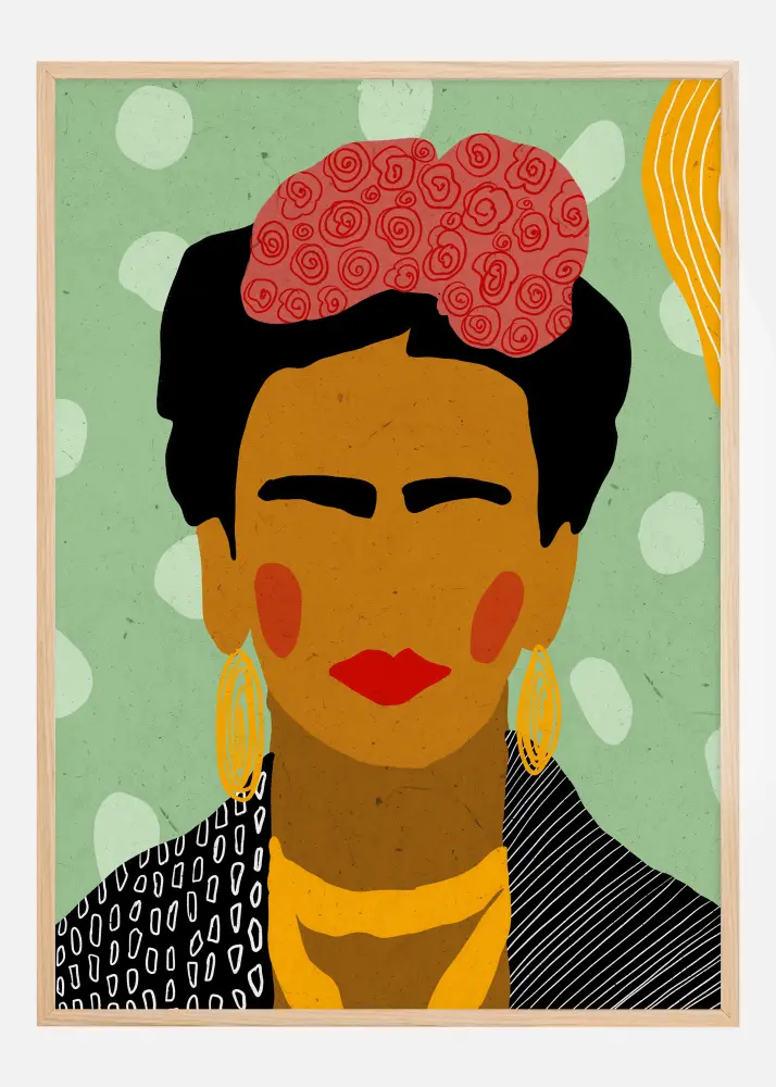 Šis plakatas yra pagarbos išraiška moterų stiprybei ir grožiui, su palete, apimančia raudoną, ochrą, juodą ir žalių atspalvių ant fono, primenančio šiltą, rankomis tapytą drobę. Tai tobula modernaus meno ir tradicinių elementų mišinys, ideali pridėti charakterį ir pasakojimui svarbią kokybę bet kuriam kambariui. Gyvas, bet kartu paprastas kompozicija daro jį unikaliu papildymu meno kolekcijoje.