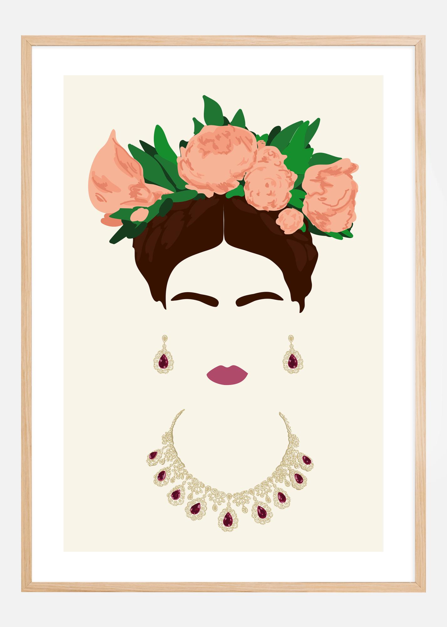 Šis išskirtinis plakatas vaizduoja stilizuotą moters figūrą, pasipuošusią turtinga flora ir elegantiškais papuošalais. Vaizde atsispindi harmoningas tamsiai rudų plaukų, kreminės odos ir spindinčio koralinės rožinės spalvos gėlių vainiko, papildyto tamsiai žaliais lapais, derinys. Jos veido ypatybės sumažintos iki minimalistinių formų, suteikiančių modernų pojūtį.