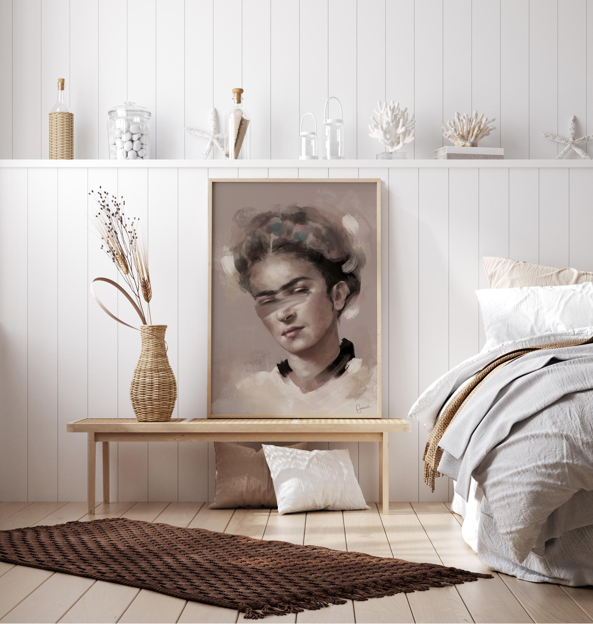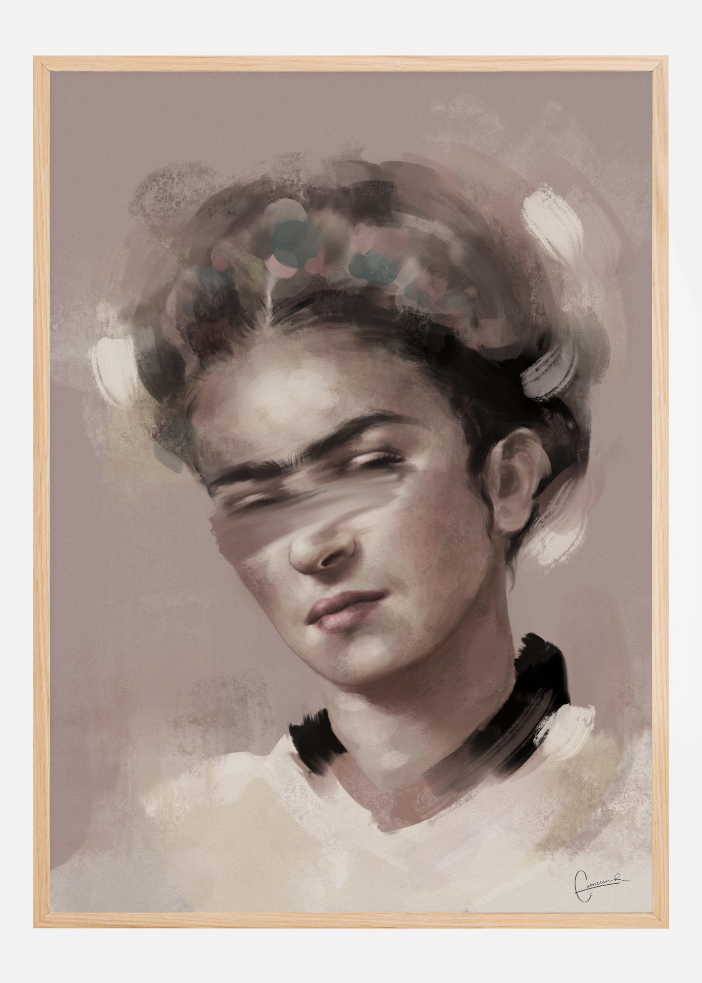 Portretinis Fridos Kahlo plakatas švelnių spalvų. Taikiai ir ramiai, ši moteris žvelgia su ramiuoju veido išraiška. Jos plaukai ir oda yra švelnių neutralų tonų, kurie prisideda prie beveik angelų pojūčio, kurį ji suteikia. Parodykite savo mėgstamiausią menininką su šiuo atspaudu.