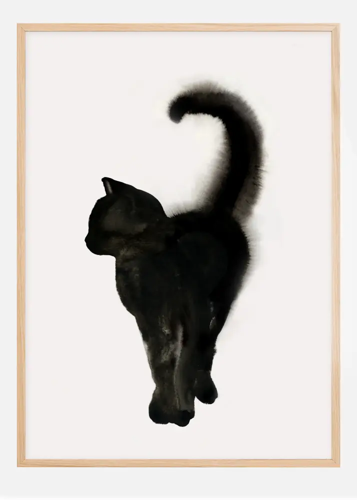 Gyvūno plakatas su juodu kačiuku, pozuojančiu baltame fone. Juoda katė stovi susidėjus letenėles ir žiūri į kairę su uodega, lenkta klaustuko forma. Kietų kontūrų ir minkštų teptuko potėpių derinys suteikia šiam paprastam vaizdui struktūrą ir daro jį įdomesnį, puikiai tinka bet kuriai sienai.