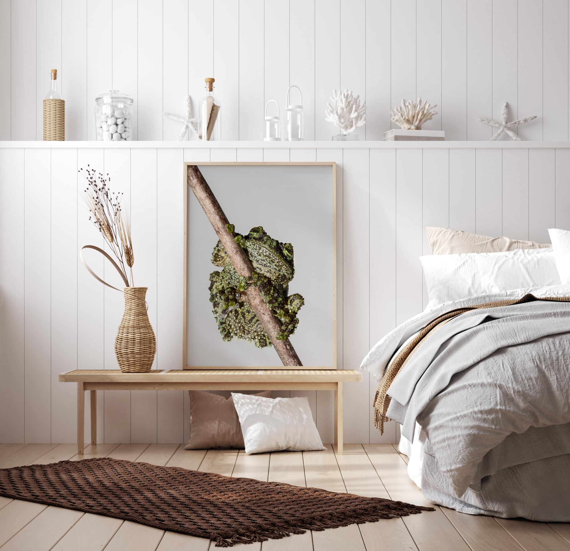 Makroposteris su varle ant medžio prieš blyškiai mėlyną dangų. Visi varlės kuprai, karpos ir visa kita matomi aiškiai, kai ji laikosi įsikibusi į ploną šakelę. Akys ir burna žvelgia virš šakelės mieloje ir žavioje nuotraukoje, kuri puikiai atrodytų ant bet kurios sienos.