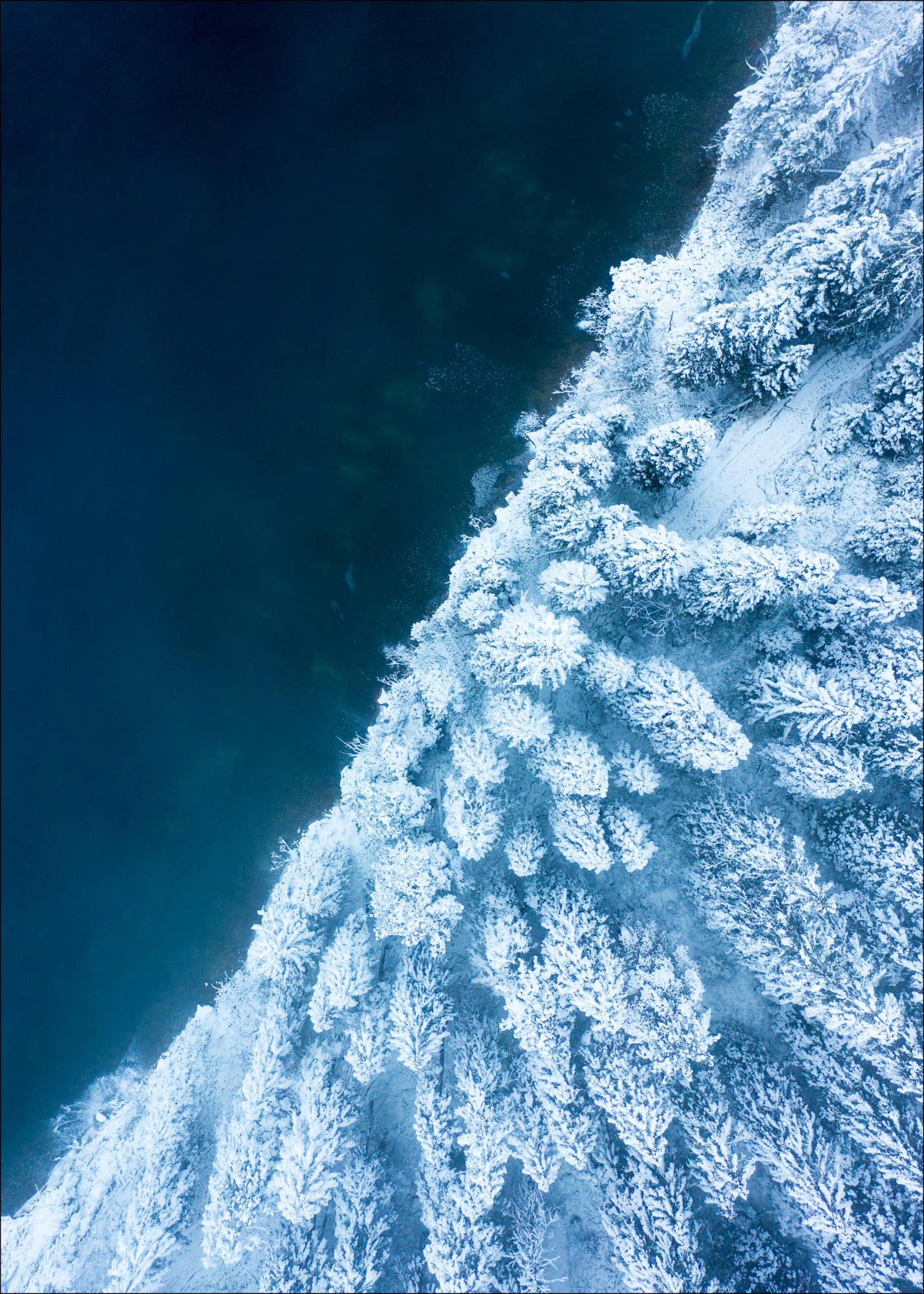 Įdomus fotografijos plakatas, darytas iš paukščio skrydžio aukščio, kuriame snieguota miško dalis susijungia su mėlynai užšalusiu jūros vaizdu aštriu kampu. Gražus gamtos plakatas šaltų tonų, puikiai tinkantis didesnės koliažo dalies.
