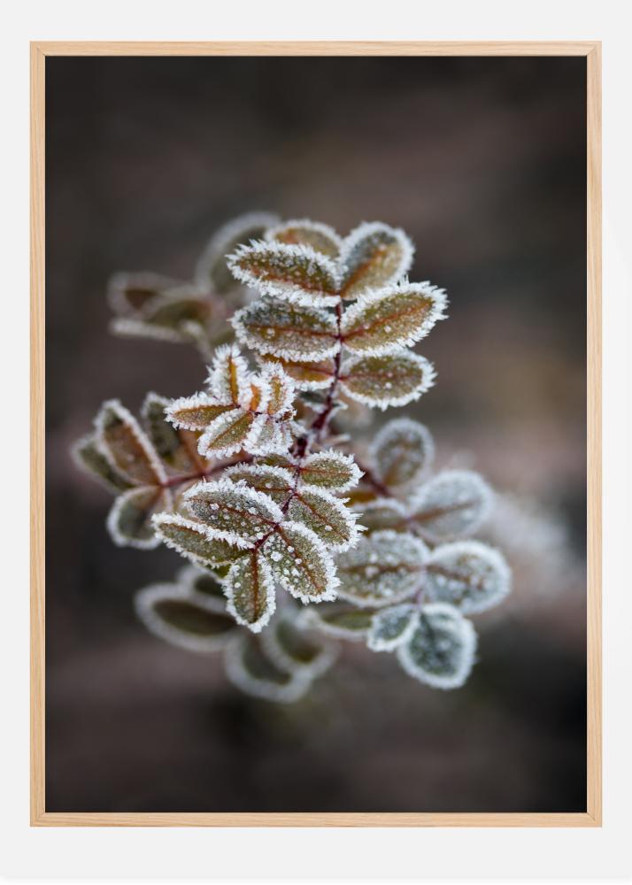 Fotografinis menas su apšerkšnijusiais rožių lapais prieš blankų foną. Lapų raudonos gyslos, žali atspalviai ir baltos ledo kristalai sukuria puikius kontrastus ir nuostabią gyvybę. Botanikos plakatas, tinkantis daugumai namų ir interjero stilių.