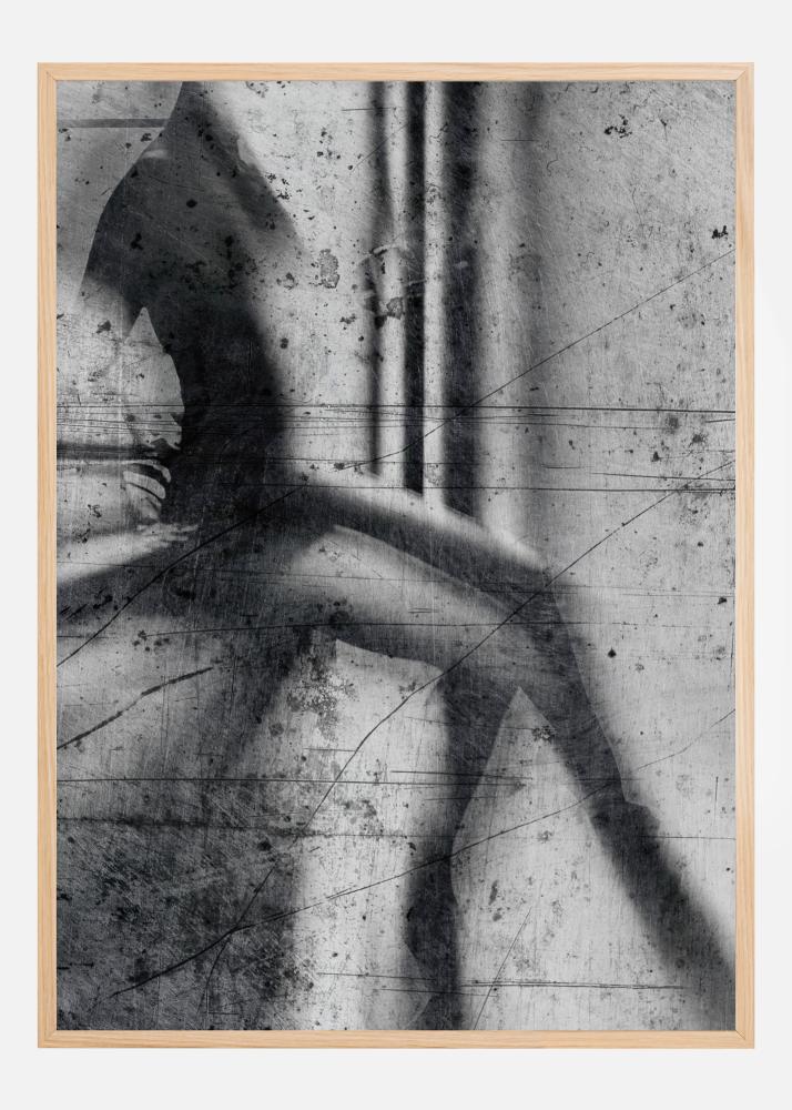 Abstraktus plakatas su moterimi, sėdinčia ant sienos. Juodai balta nuotrauka pilna linijų ir minkštų kampų, kad sukurtų šį meninį, impresionistinį kūrinį. Pakabinkite ant baltos sienos, kad sukurtumėte dramatišką įspūdį, arba derinkite su ryškia spalva daugiau dramatizmo.