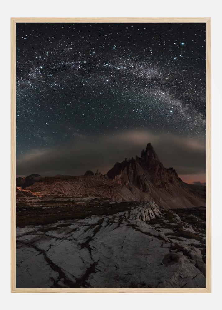 Nuostabus plakatas su Dolomitinių Kalnų masyvu ir virš jo - galaktika. Raudonieji uolos kyla aukštai į žvaigždes. Paukščių takas viršuje susikerta su švytinčių žvaigždžių spiečiumi, sukuriant magišką sceną. Pakabinkite šią ant savo sienos ir pasinerkite į nuostabų pasaulį.