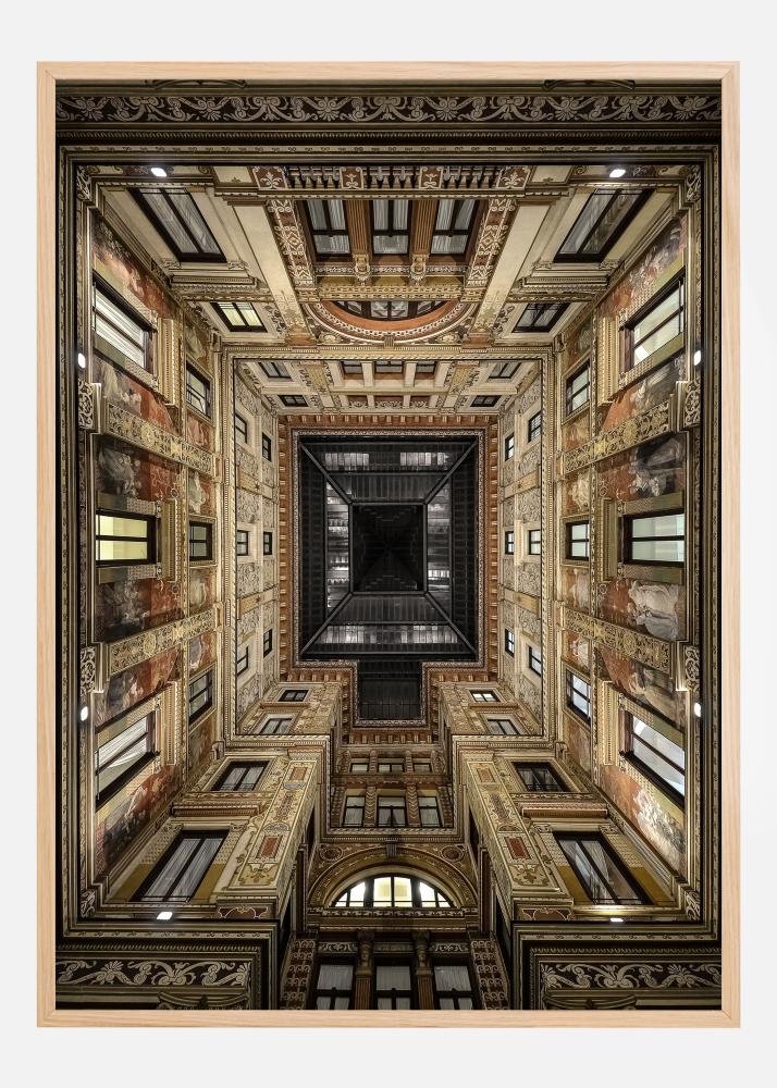Interjero plakatas su Galleria Sciarra ir nuostabia jos architektūra. Įsivaizduokite, kad esate pastate, žiūrite į viršų ir matote nuostabų langų ir sudėtingų raštų asortimentą. Pasikvieskite šią kelionę į savo namus.
