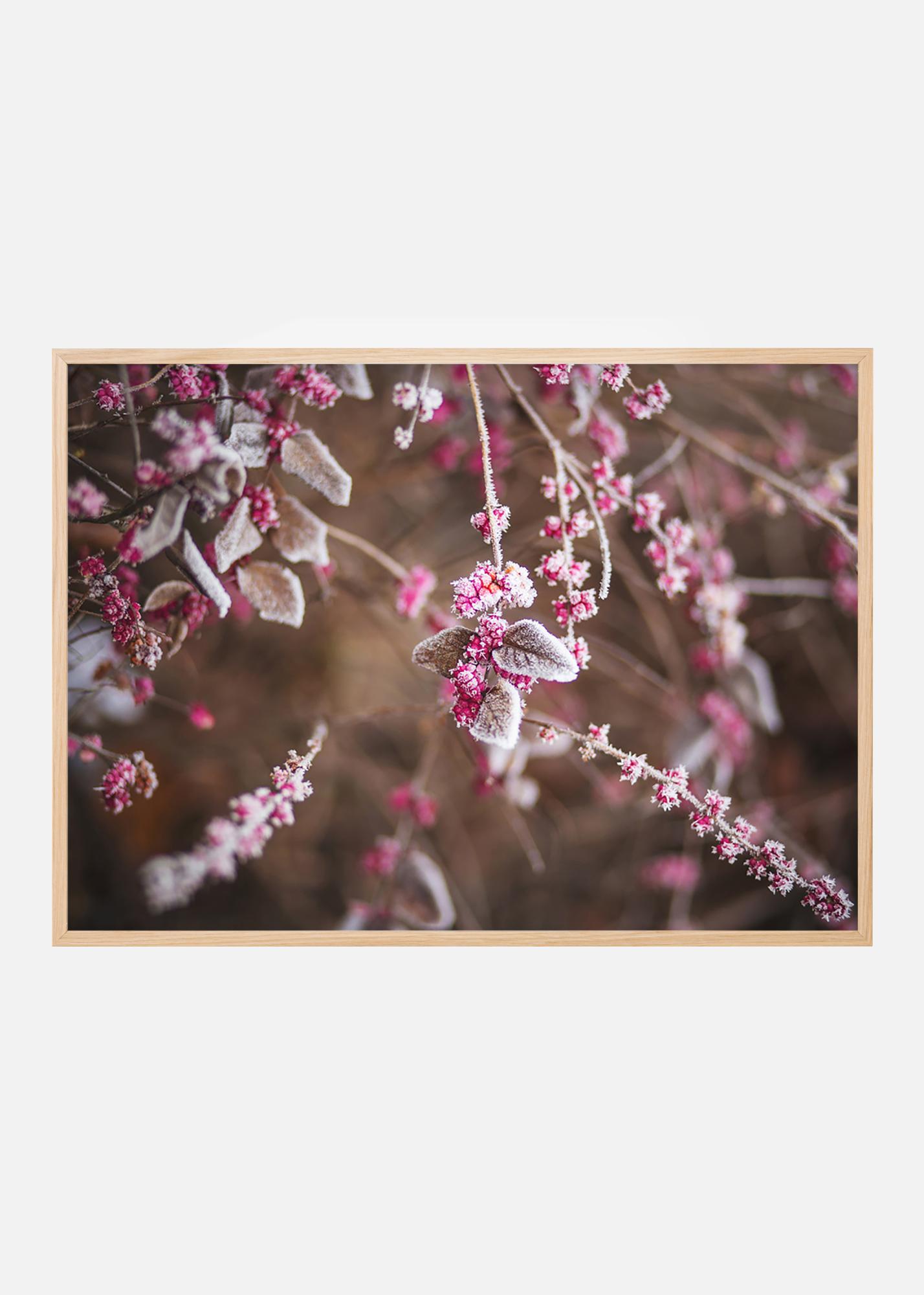 Fotografijos menas su šerkšnu padengtų rausvų uogų stambiu planu ir nedidele ryškumo zona. Spausdinys su rožinėmis uogomis ir šokoladinių tonų fonu suteikia šiltą ir jaukią jausmą. Didesniame dydyje su gražiu rėmu tapetą taps žvilgsnį traukiančiu objektu svetainėje, arba panaudokite mažesnį variantą paveikslų koliaže kartu su kitais tos pačios spalvų atspalvių posteriais.