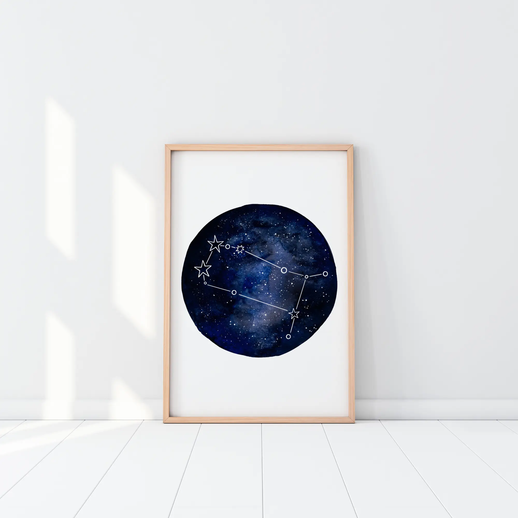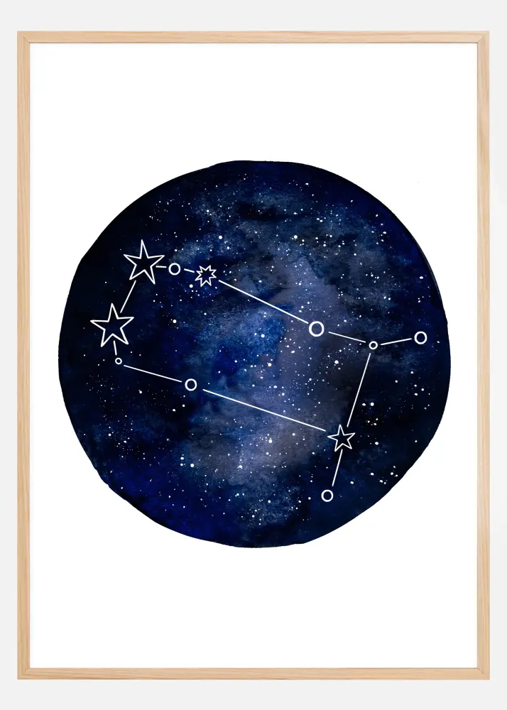 Horoskopo plakatas su Dvynių zodiako ženklu. Didelis tamsiai mėlynas ratas su žvilgančiomis žvaigždėmis. Dvynių žvaigždynas aiškiai nupieštas, kad galėtumėte matyti savo zodiako ženklą. Pakabinkite čia, jei esate Dvyniai ir didžiuojatės tuo.