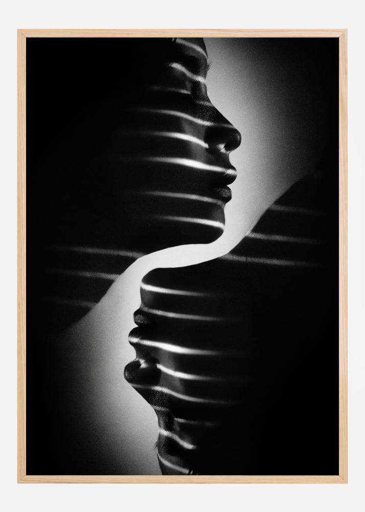 Plakatas su dramatišku dvigubu profiliu dviejų veidų portretu. Šviesos juostos dramatiškai apšviečia šiuos tamsius veidus, o foninė šviesa sukuria aureolę. Pakabinkite jį ant baltos sienos, kad sustiprintumėte šio juodai balto spaudinio dramatiškumą.