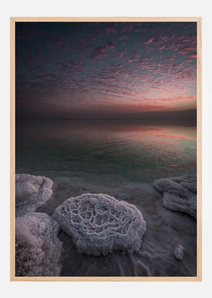 Gražus plakatas su plačiu ežeru. Priekyje susiformavo dideli druskos kristalai, kurie kuria nuostabius natūralius raštus. Ežeras tęsiasi iki horizonto, o dramatiškai raudonas ir mėlynas nakties dangus prisideda prie magiškos jausmo šioje nuotraukoje.