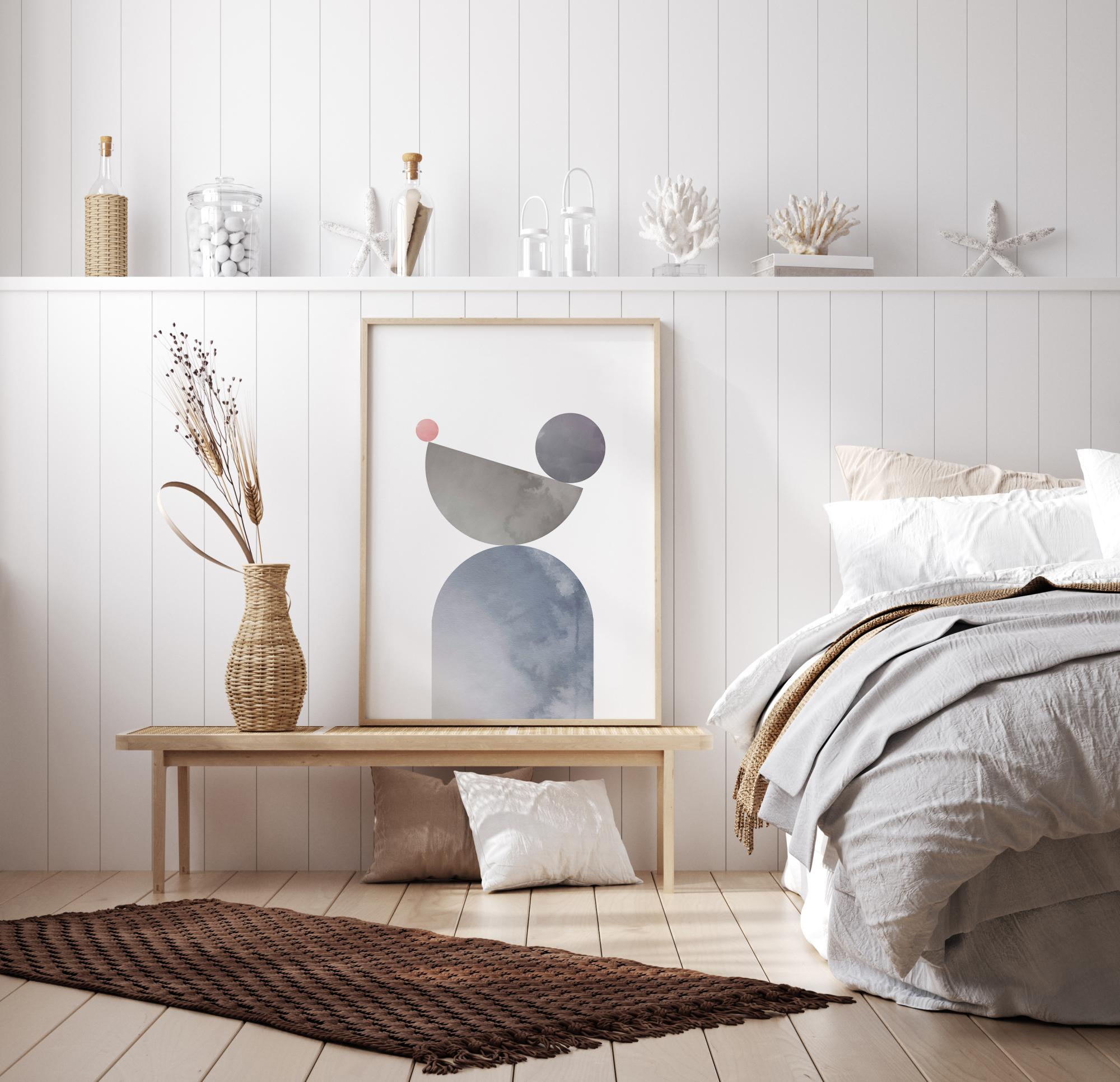 Abstraktus plakatas su geometrinėmis formomis ir apskritimais. Apatinėje dalyje yra didelė mėlyna debesuota forma. Viršuje balansuoja pilka puslankė su mažu rožiniu apskritimu viename gale ir dideliu mėlynu kitame. Galite sėdėti valandų valandas ir žavėtis šio paveikslo pusiausvyra.