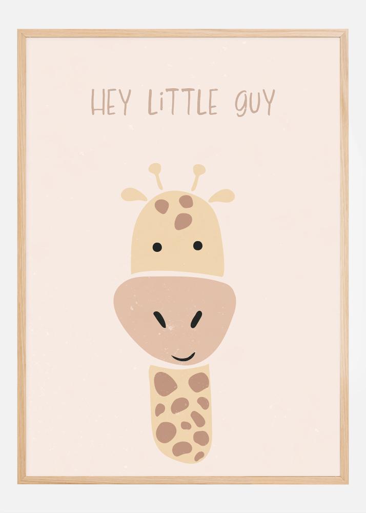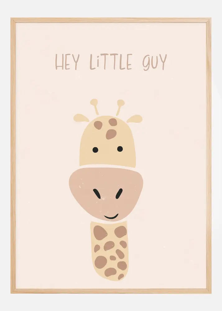 Ši žavinga plakatė su tekstu "HEI MAŽAS VAIKELI" ir žirafos jauniklio iliustracija yra puikus sienų papuošimas vaiko kambariui arba žaismingam prisilietimui kitame šviesiame kambaryje. Motyvas pasižymi švelniomis spalvomis, tokiomis kaip švelniai rožinė fone, ir šiltomis smėlinėmis bei rudomis spalvomis žirafos piešinyje. Pieštinė žirafa, su savo paprastu ir vaikams draugišku dizainu, turi didelę šypseną ir draugiškas akis, kas sukuria tiesioginį ryšį ir prisideda prie linksmos ir svetingos atmosferos.
