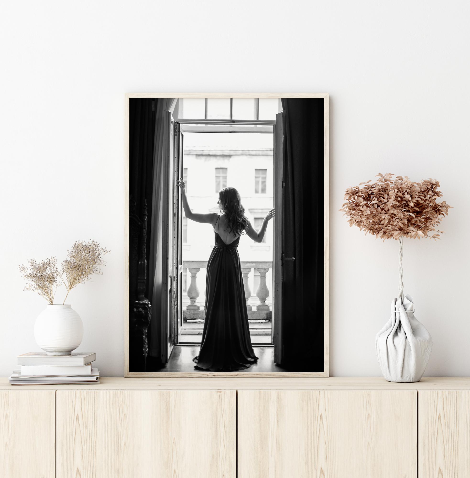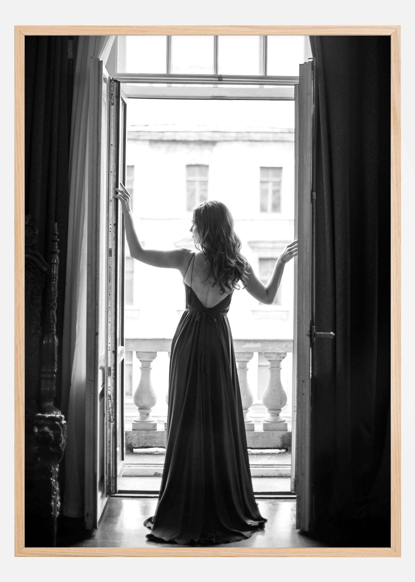 Juodai baltas moters nuotrauka, apsirengusios ilga suknele, stovinčios prie plačiai atvirų balkonų durų, žvelgiant į dieną. Prieš ją matosi nusidėvėję betoniniai stulpai ir susidėvėjusi sena fasadas. Plakatas, kvėpuojantis puikiu grožio ir gyvybingumo mišiniu, kontrastuodamas su sena ir oru išžiurėta aplinka.