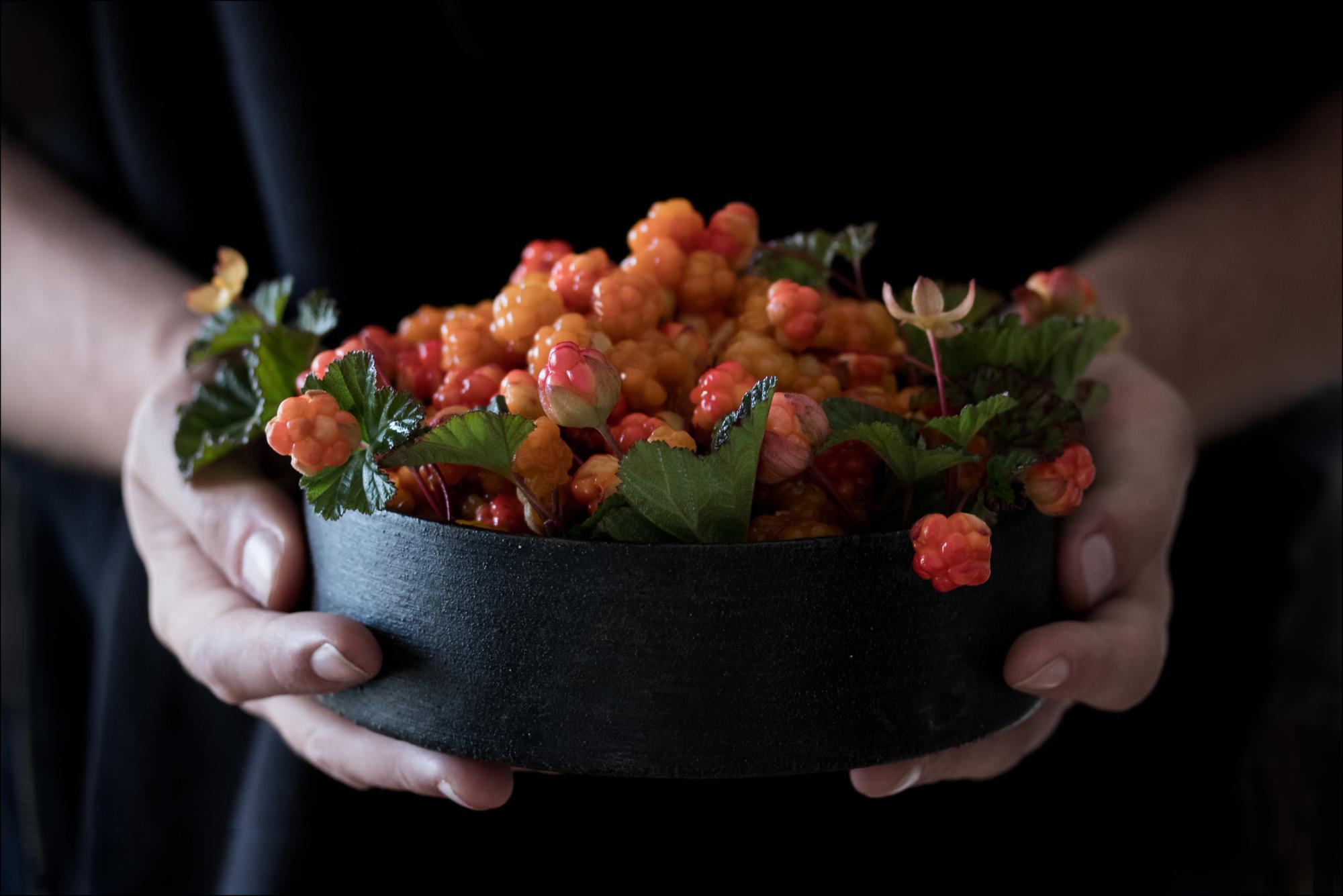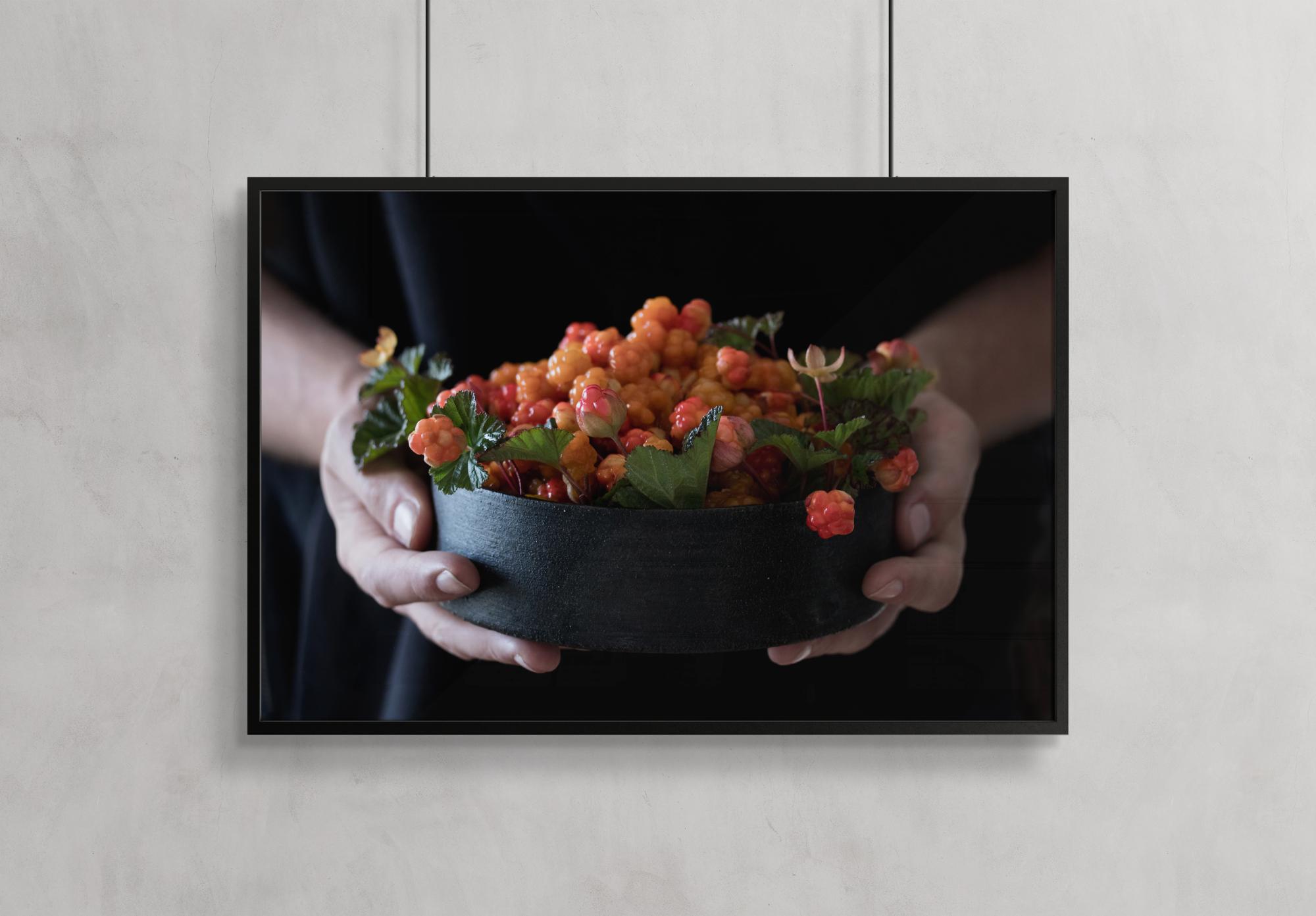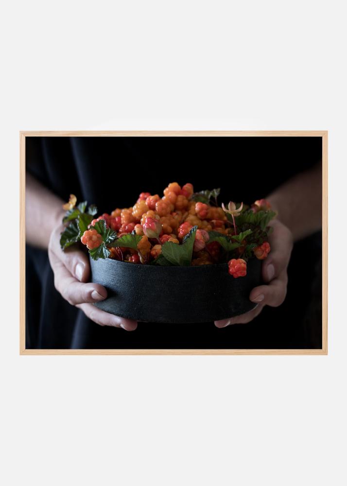 Vaisių plakatas su auksinėmis uogomis, esančiomis dubenyje, kurį laiko dvi rankos. Šiame gaiviame fotografijoje matomos auksinės uogos ir lapai paprastame juodame dubenyje. Dvi rankos jį laiko ir tarsi nori jį perduoti jums būtent ten ir tada.