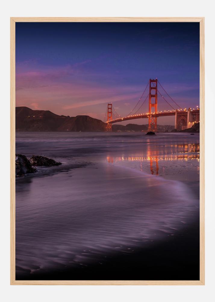 Auksinio Vartų tilto naktinis plakatas. Auksinės lempos apšviečia šį garsų tiltą ir atsispindi vandenyje apačioje. Pakrantės dalis yra pirmame plane, vanduo veda akį prie tilto ir nuostabaus mėlyno ir aukso spalvos dangaus, kuriame leidžiasi saulė. Pasinerkite į šį nuostabų naktinį vaizdą.