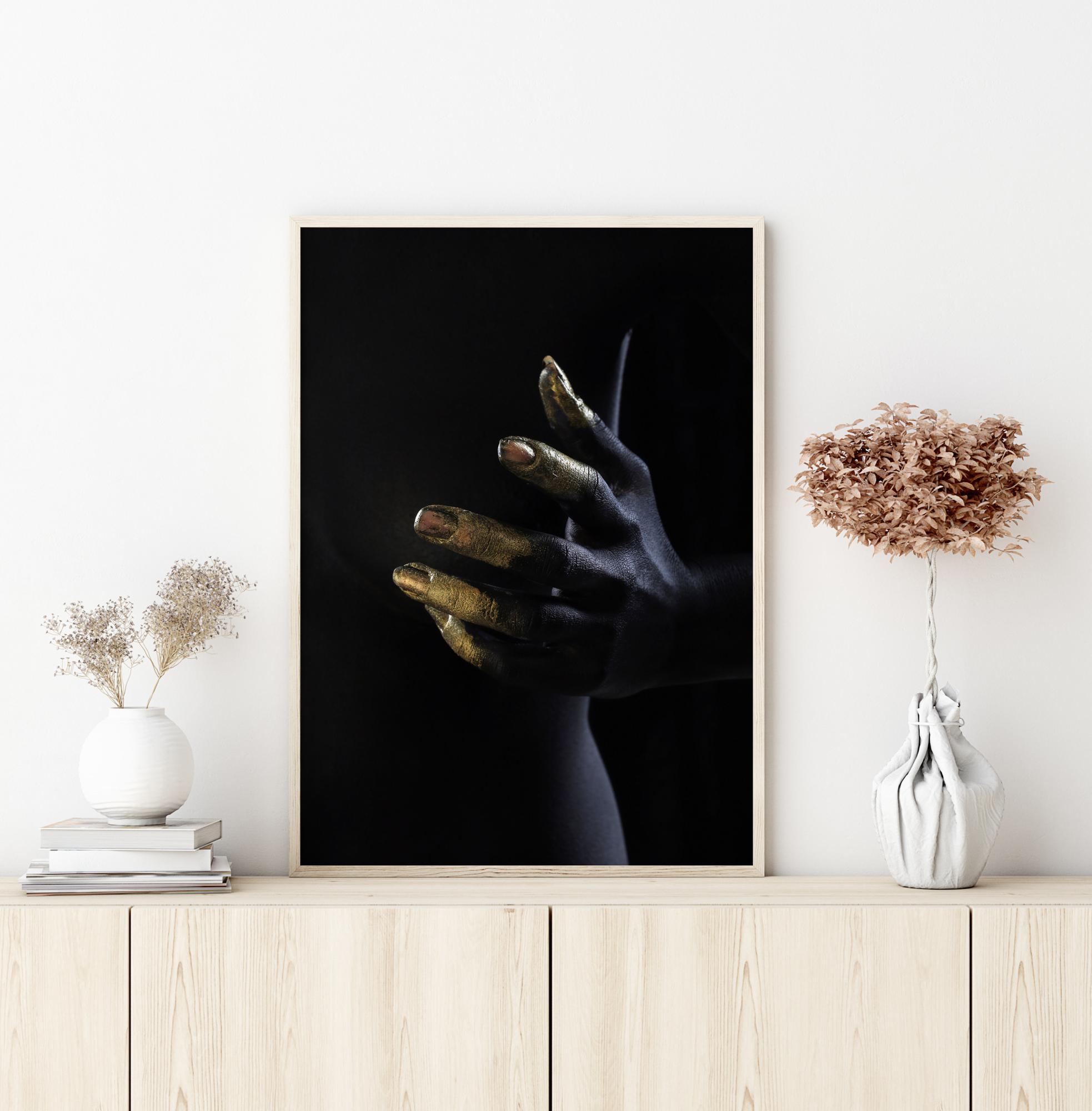 Kontrastingas plakatas, kuriame pilna dramos su į priekį ištiesta ranka. Pusė rankos yra juoda, o pirštai nudažyti auksiniais dažais, kai ranka yra ištiesta. Matoma dalis kūno yra apšviesta šviesa iš dešinės pusės, kad išryškėtų juodo fono fone. Tikrai meniškas vaizdas, puikiai tinkantis neutralioms sienoms.