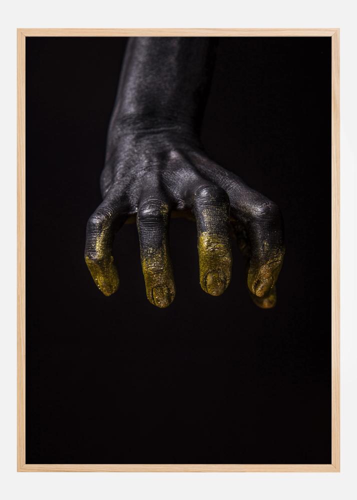 Dramatiška plakatas su lipnia ranka, besitiesiančia žemyn. Juoda ranka įeina iš viršaus į nuotrauką, pirštai išlenkti, pasiruošę kažką sugriebti. Pirštų galiukai yra padengti žvilgančiu auksu, kad išsiskirtų. Pridėkite šį epinį vaizdą savo namams.