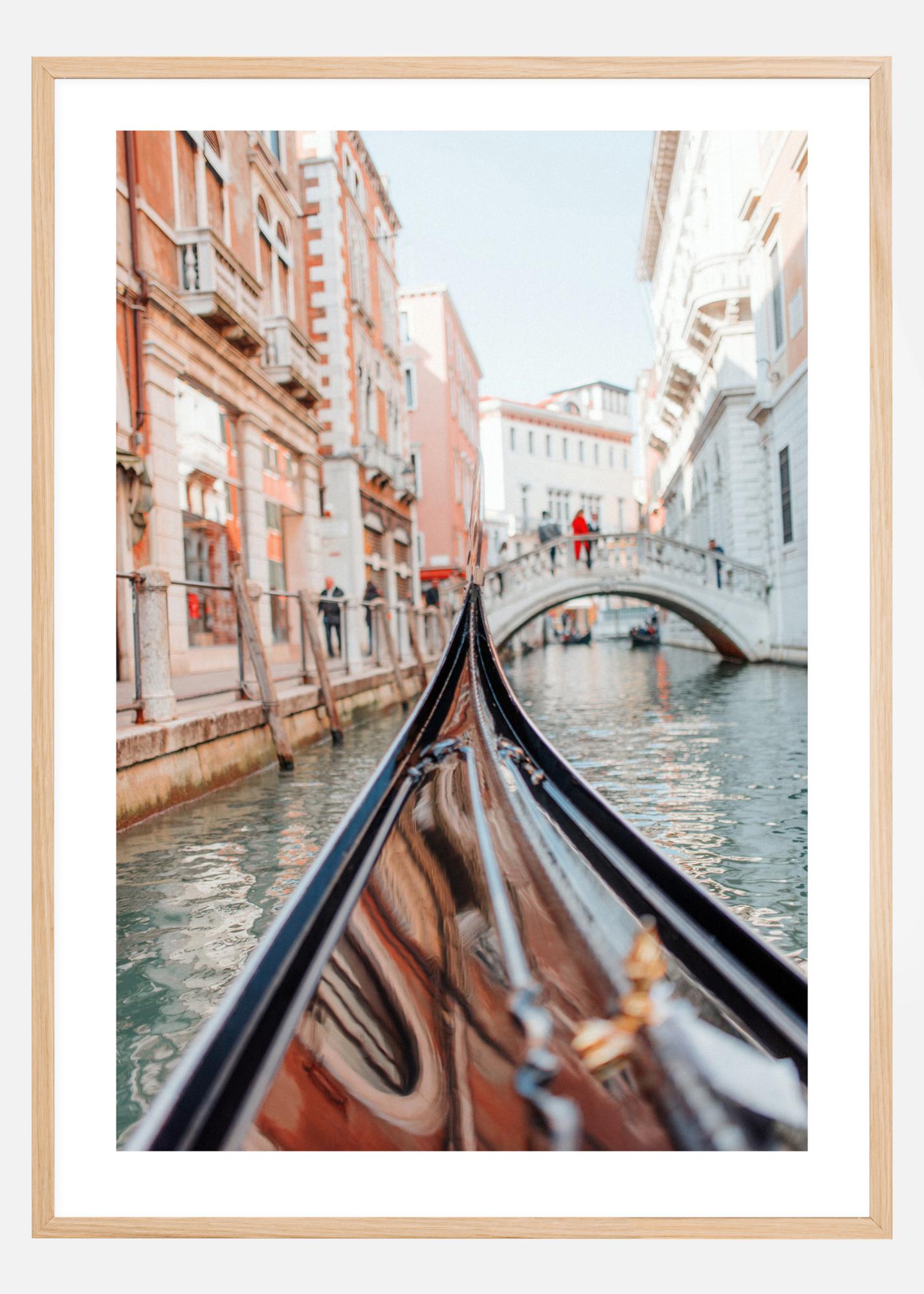 Klasikinis plakatas su gondolos priekiniu galu, plaukiančiu per Venecijos kanalus. Kanalas eina tarp švelnių rožinių ir baltų namų, pakeliui link baltos tilto, ant kurio stovi ir stebi žmonės. Įsivaizduokite, kad esate atostogose, kai parnešate vaizdą namo.