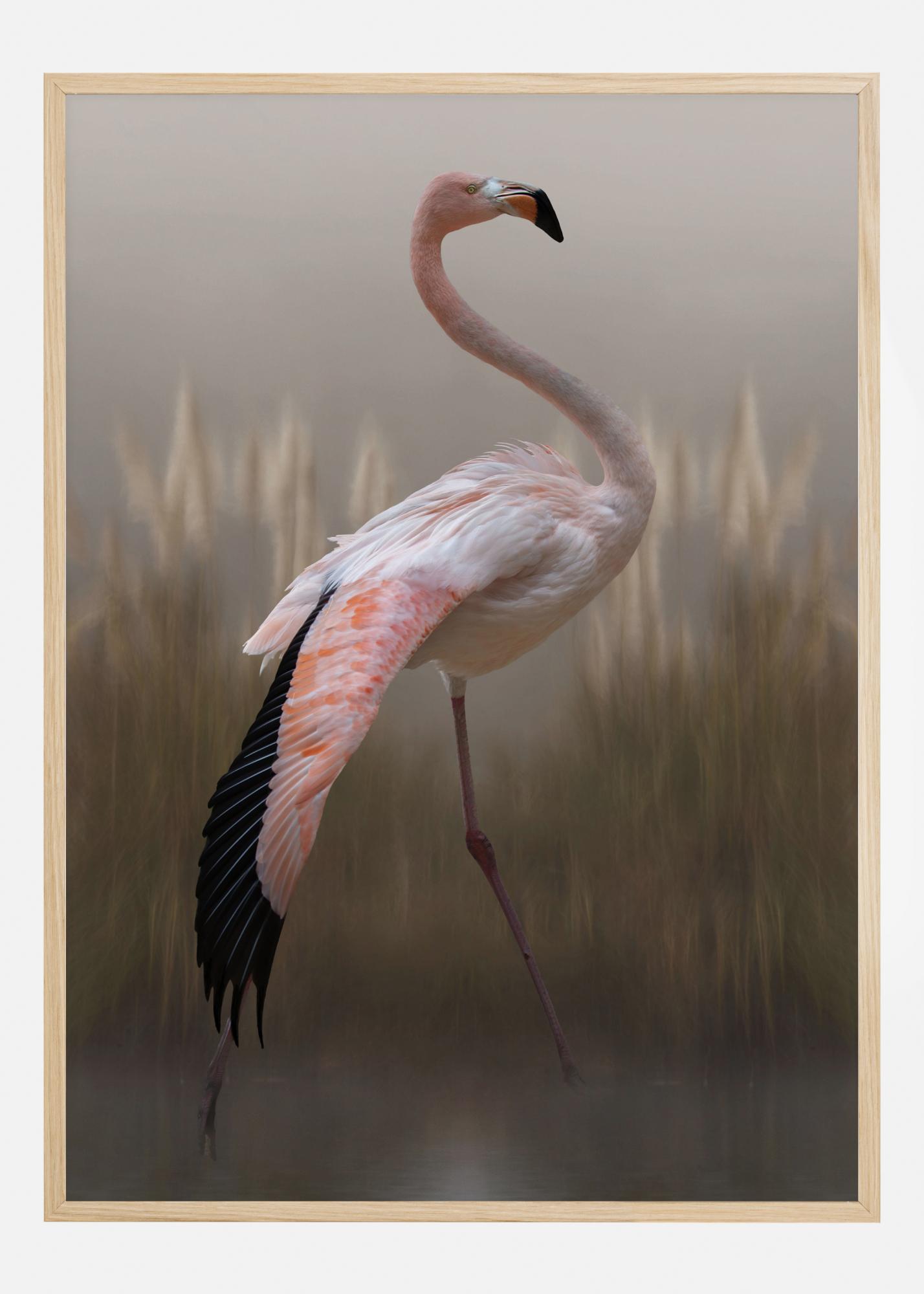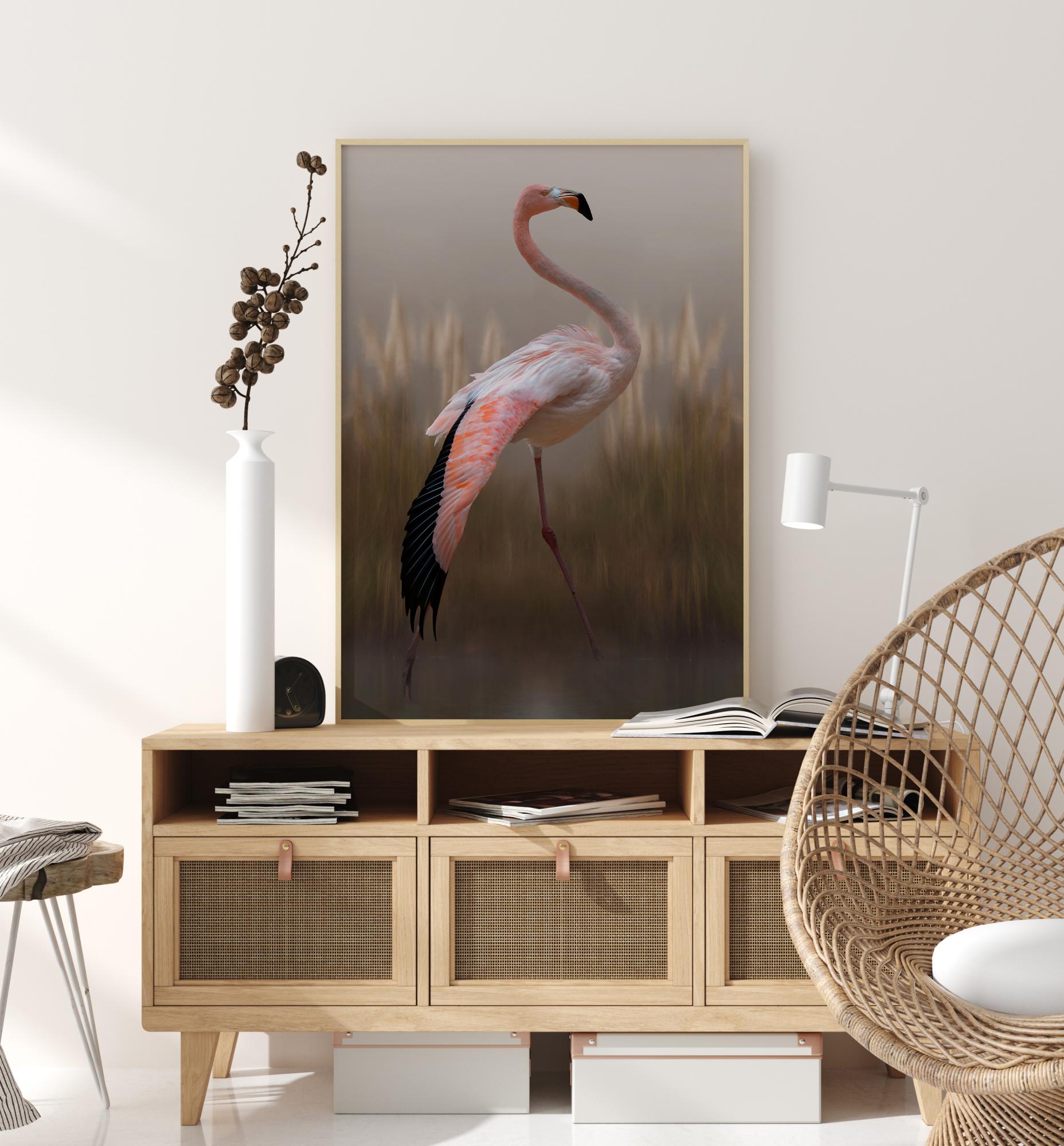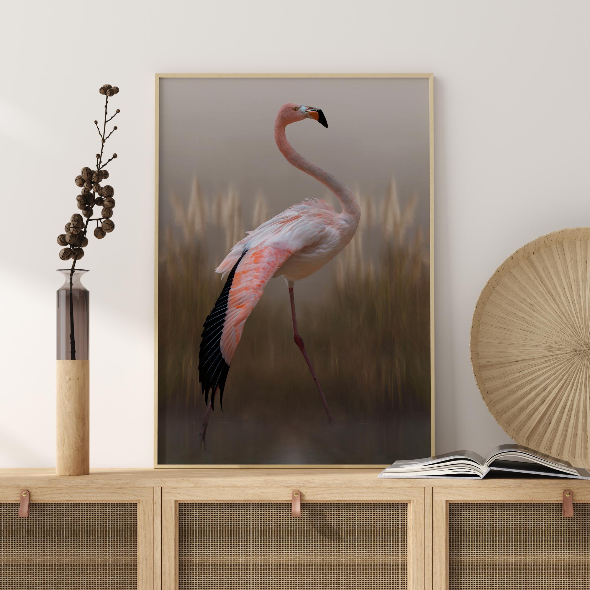 Plakatas su žengiančiu rausvu flamingu. Spalvų tonai ir nuotraukos neryškumas beveik suteikia tapybos jausmą. Galite įsivaizduoti, kaip žengiate kartu su paukščiu, kai šį plakatą derinate su paprasta mėlyna siena.