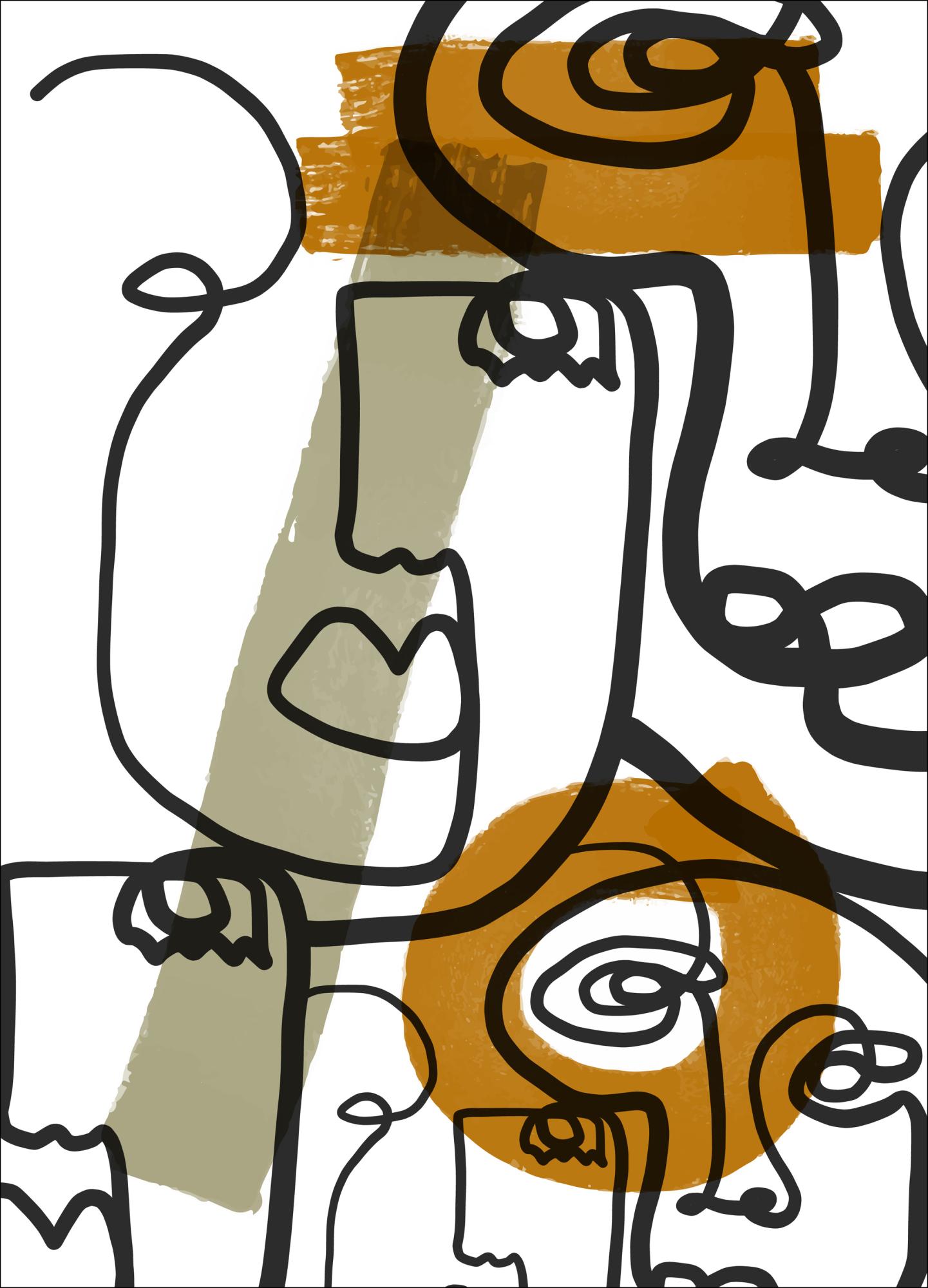 Grafinis linijinio meno plakatas su veidais, nudažytais juodai baltame, pilkame ir rudos spalvos fone. Abstraktus ir gyvas plakatas idealiai tinka moderniame namuose ir puikiai atrodo virtuvėje, koridoriuje, svetainėje ar miegamajame.