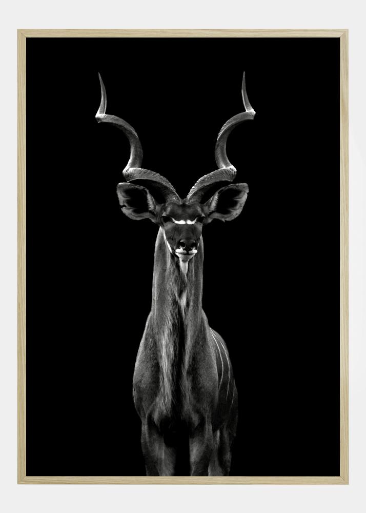 Laukinės gamtos plakatas su didesniu Kudu, kuris stovi didingas prieš juodą foną. Ši didinga antilopė žiūri į kamerą, susukti ragai siekia aukštyn, kad užpildytų vaizdą. Pridėkite šį nuostabų juodai baltą gyvūno portretą prie savo namų, kad suteiktumėte didingumo.