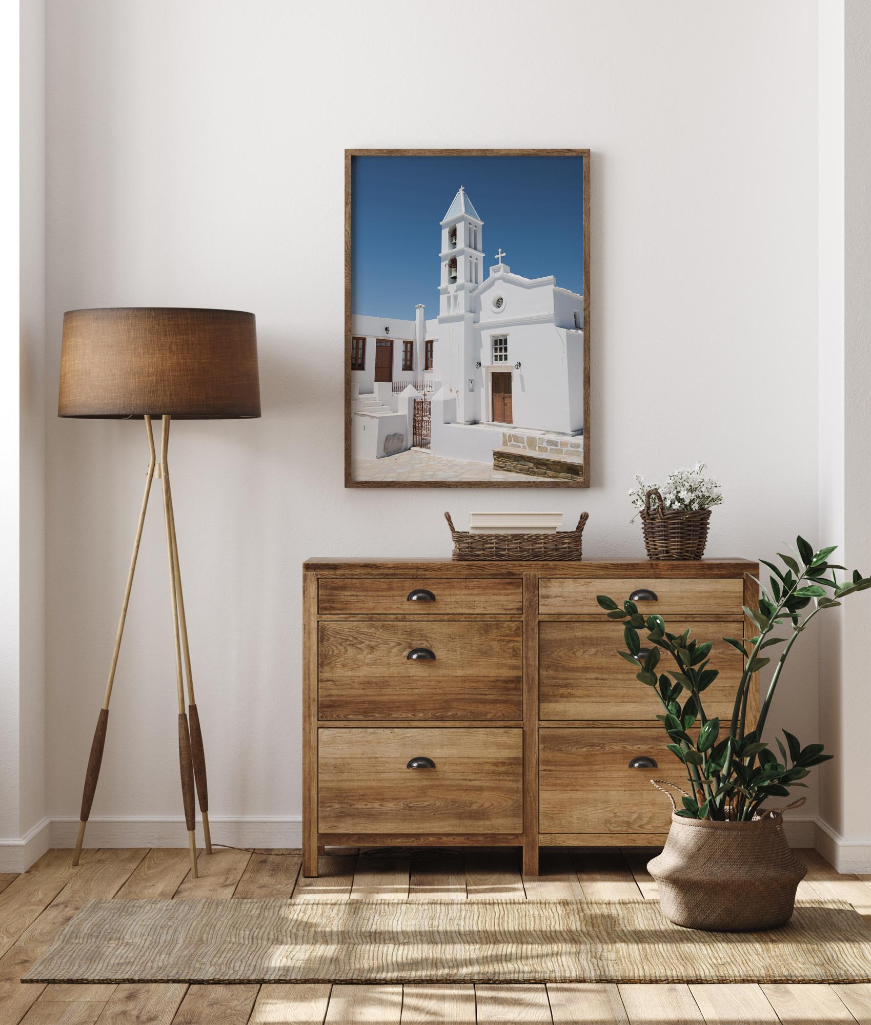Architektūrinis plakatas su balta bažnyčia Graikijoje prieš nuostabiai mėlyną dangų. Baltos ir mėlynos spalvų kontrastas sukuria egzotiškumo jausmą šviesiu ir gyvybingu būdu šioje paprastoje, bet įtraukiančioje nuotraukoje. Kai pakabinsite šį plakatą, galėsite atostogauti neišeidami iš namų.