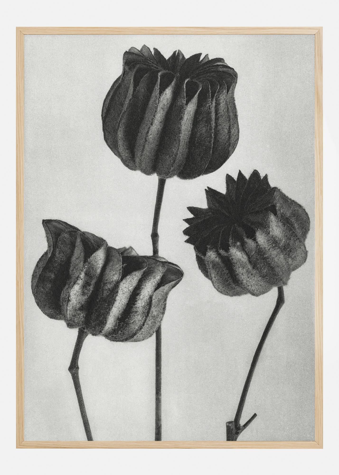 Nuostabus juodai baltas modernus spaudinys su trimis skirtingo aukščio gėlėmis. Centrinė gėlė turi tiesią kotelį, o kitos dvi yra sulenktos. Prie balto fono šis paprastas, bet subtilus plakatas puikiai tinka kabinti ant šviesios svetainės sienos.