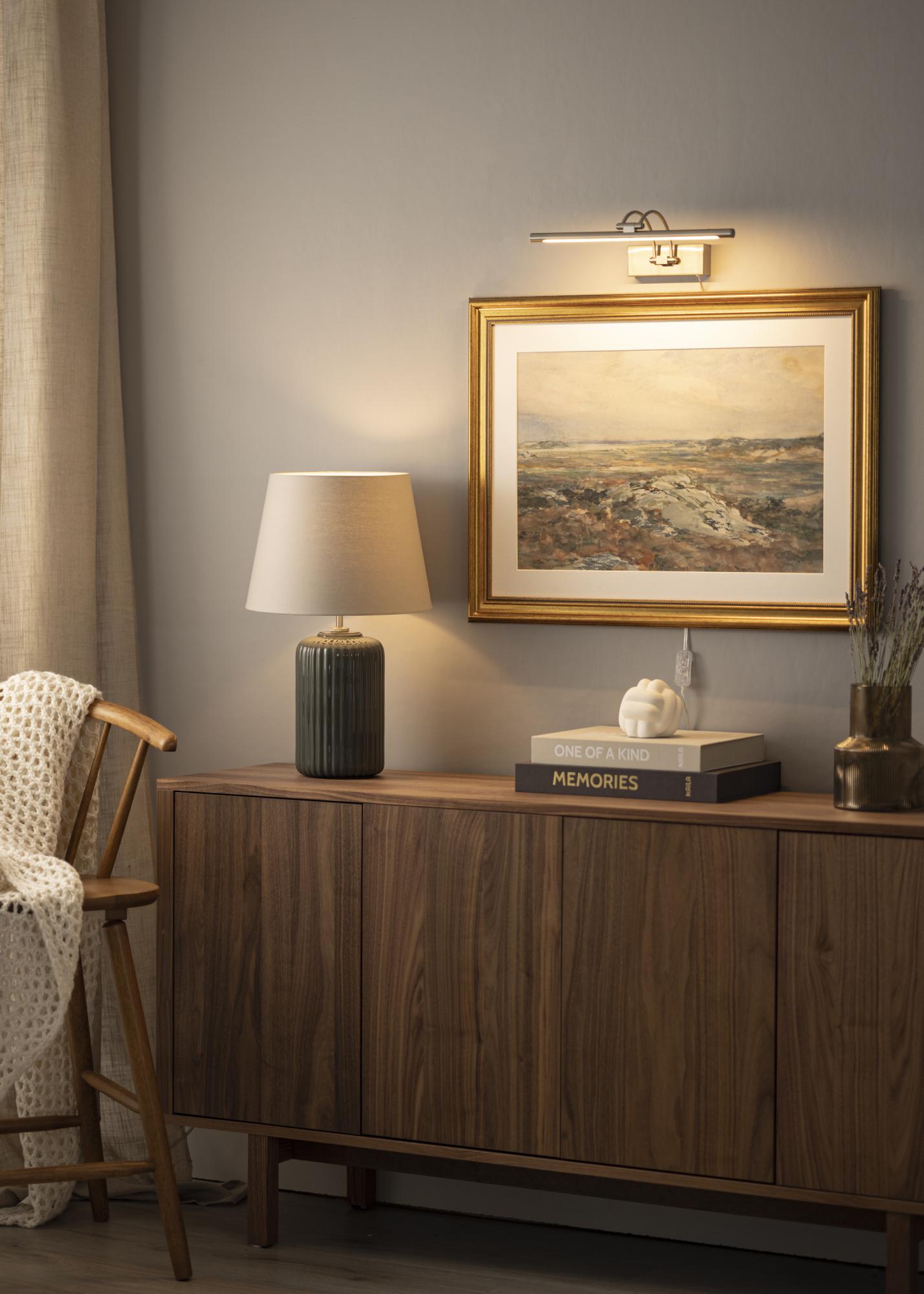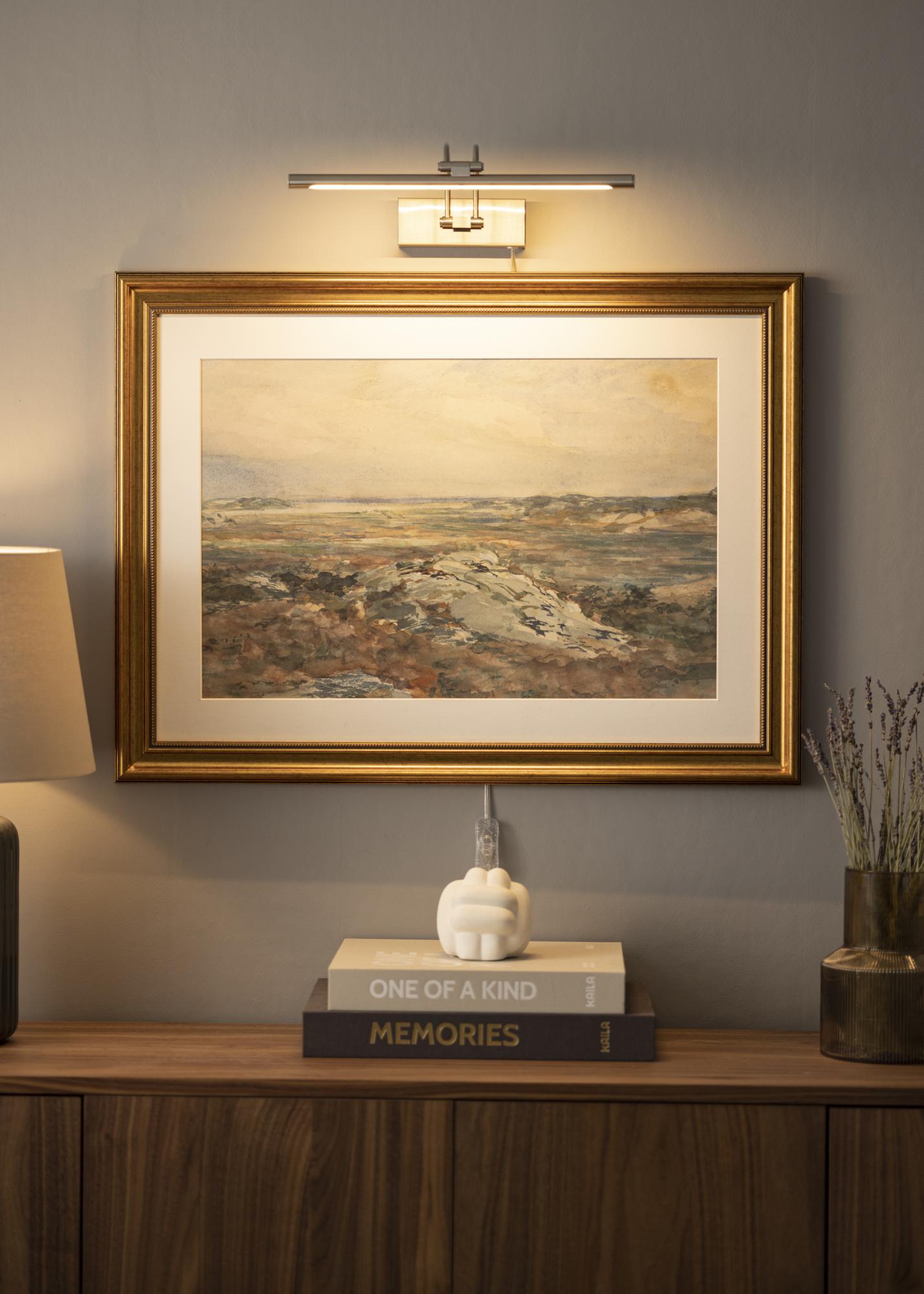 Paveikslų apšvietimas šiuolaikinio švedų dizaino, tinkantis paveikslams, kurių plotis 60-100 cm. Šviestuvo aukštis yra 5 cm, o ilgis 37 cm, atstumas iki sienos - 20 cm. Su savo stipriu 720 liumenų LED apšvietimu jūs gausite malonų apšvietimą net ir didesniems paveikslams.